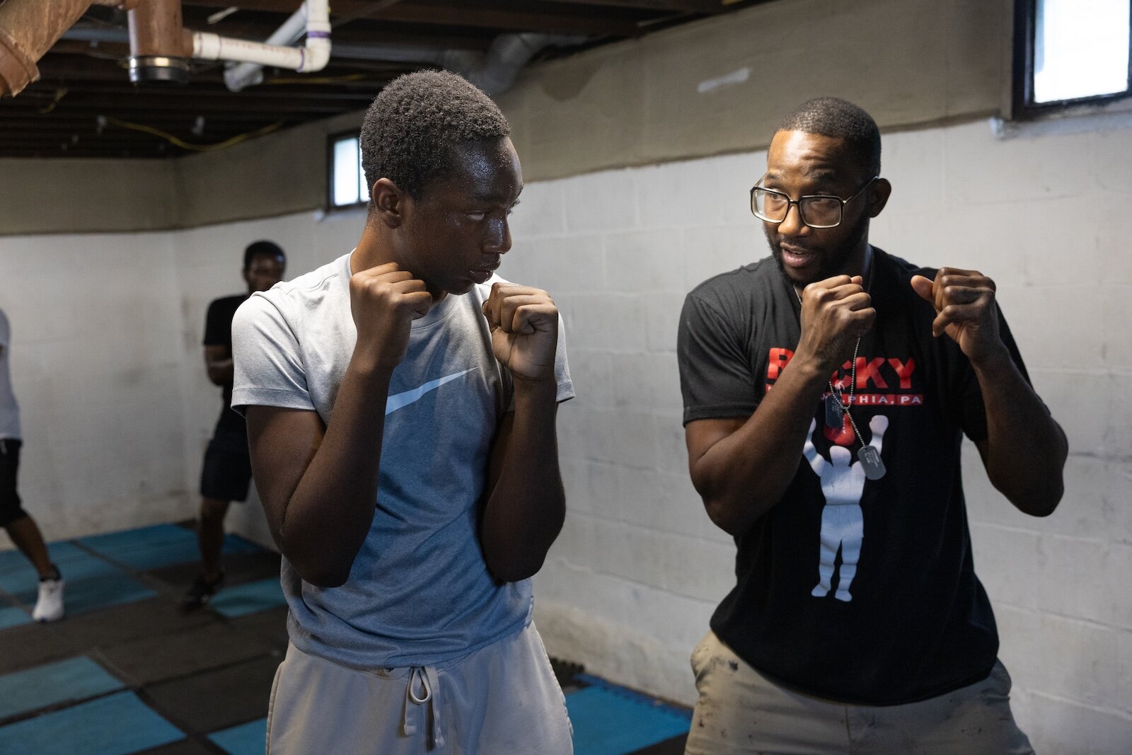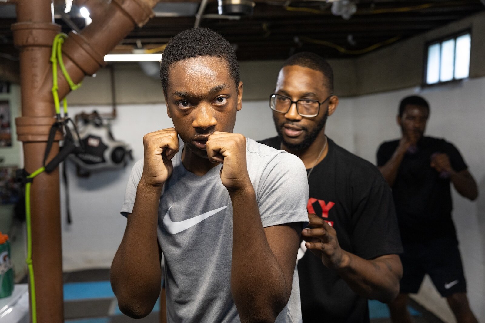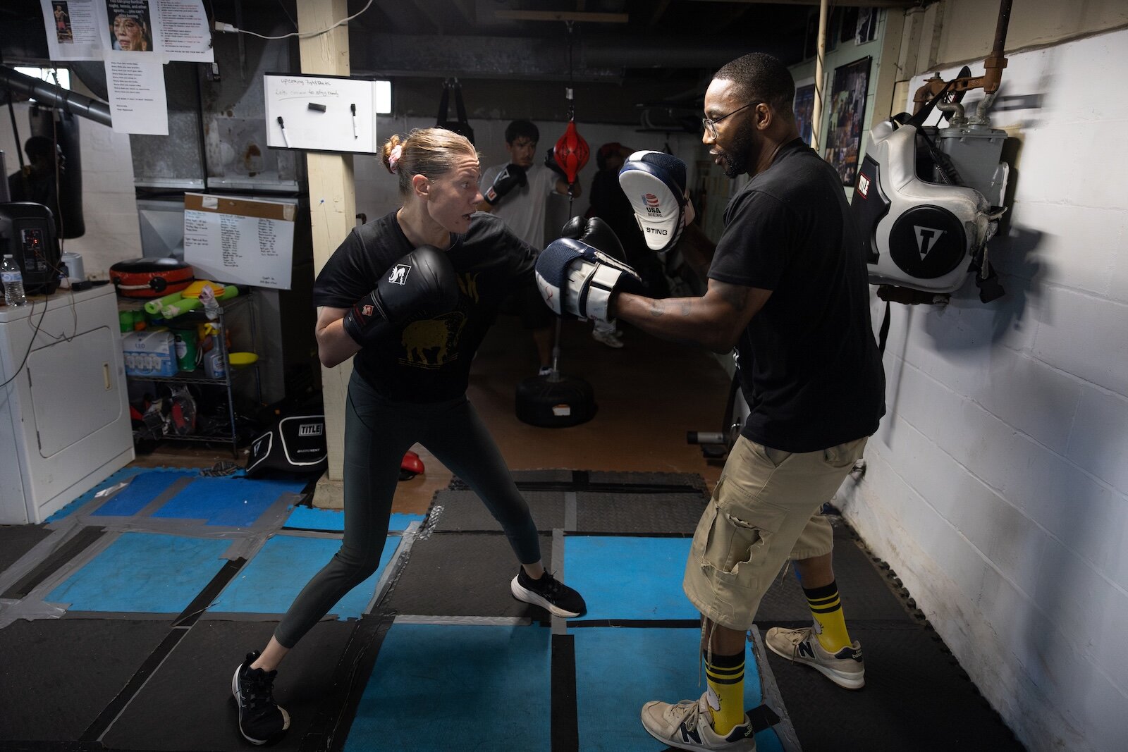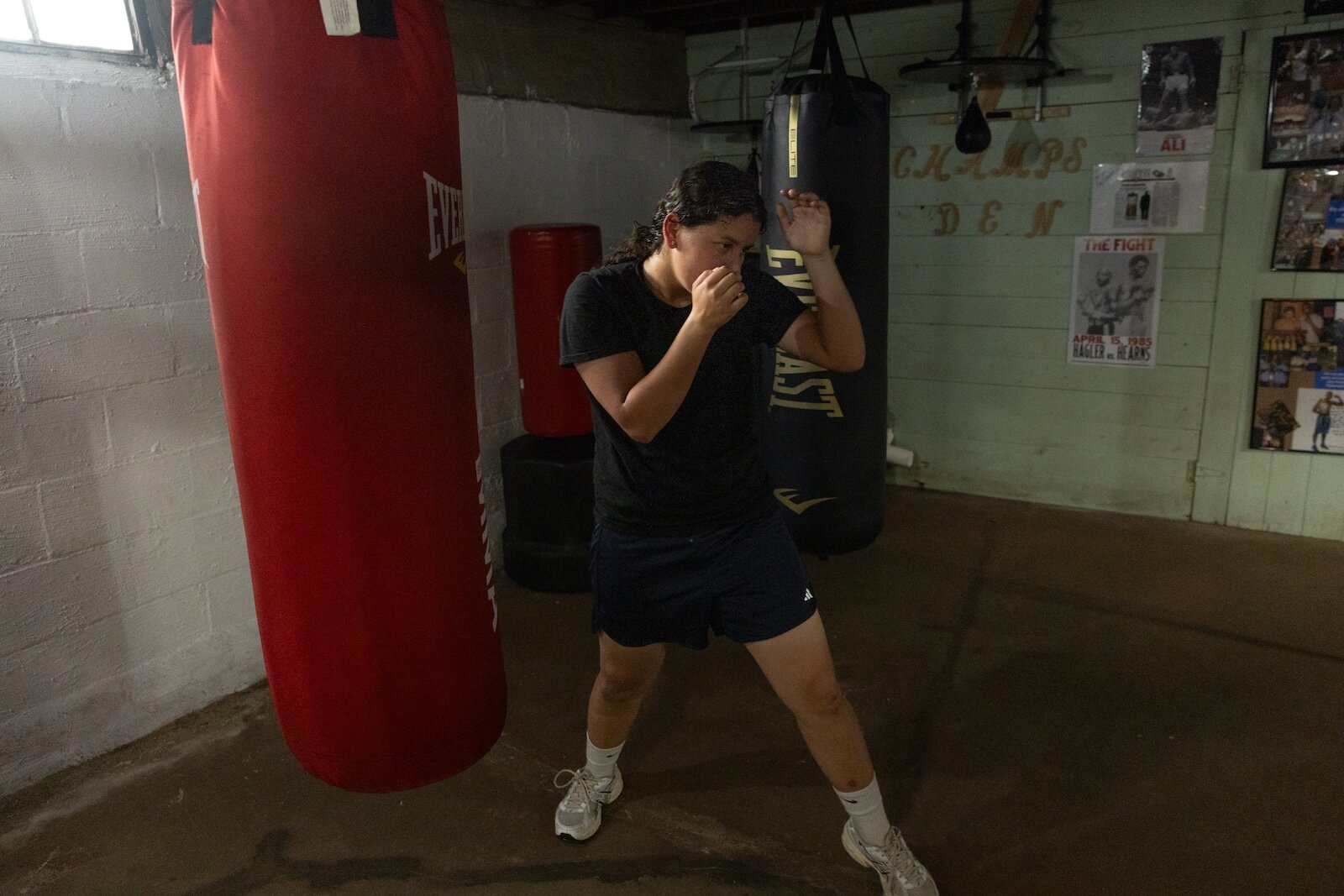 There are no boxes of old clothes or memorabilia in this basement; instead, mats line the floor and punching bags hang from the ceiling. The back wall is filled with pictures and hung gloves.
