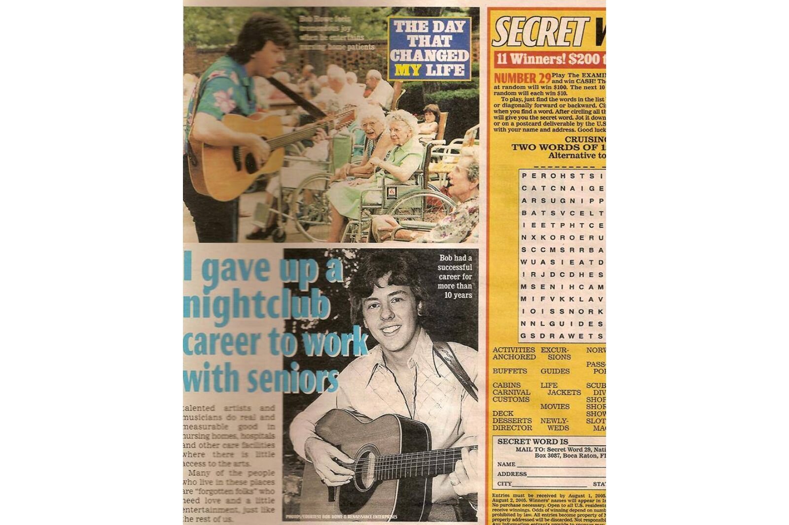 Seeing the joy light up the faces of his audience, Rowe knew he had found his life path. At times, he would perform solo and other times with groups such as the Green Valley Boys. His work with the elderly gained notoriety and funding. Rowe was written up as “leaving a lucrative music career” to perform instead in senior facilities in publications such as Time magazine, USA Today, Catholic Digest, Daily Word, National Enquirer, and Detroit News. He appeared on national news programs such as CNN and PBS.
