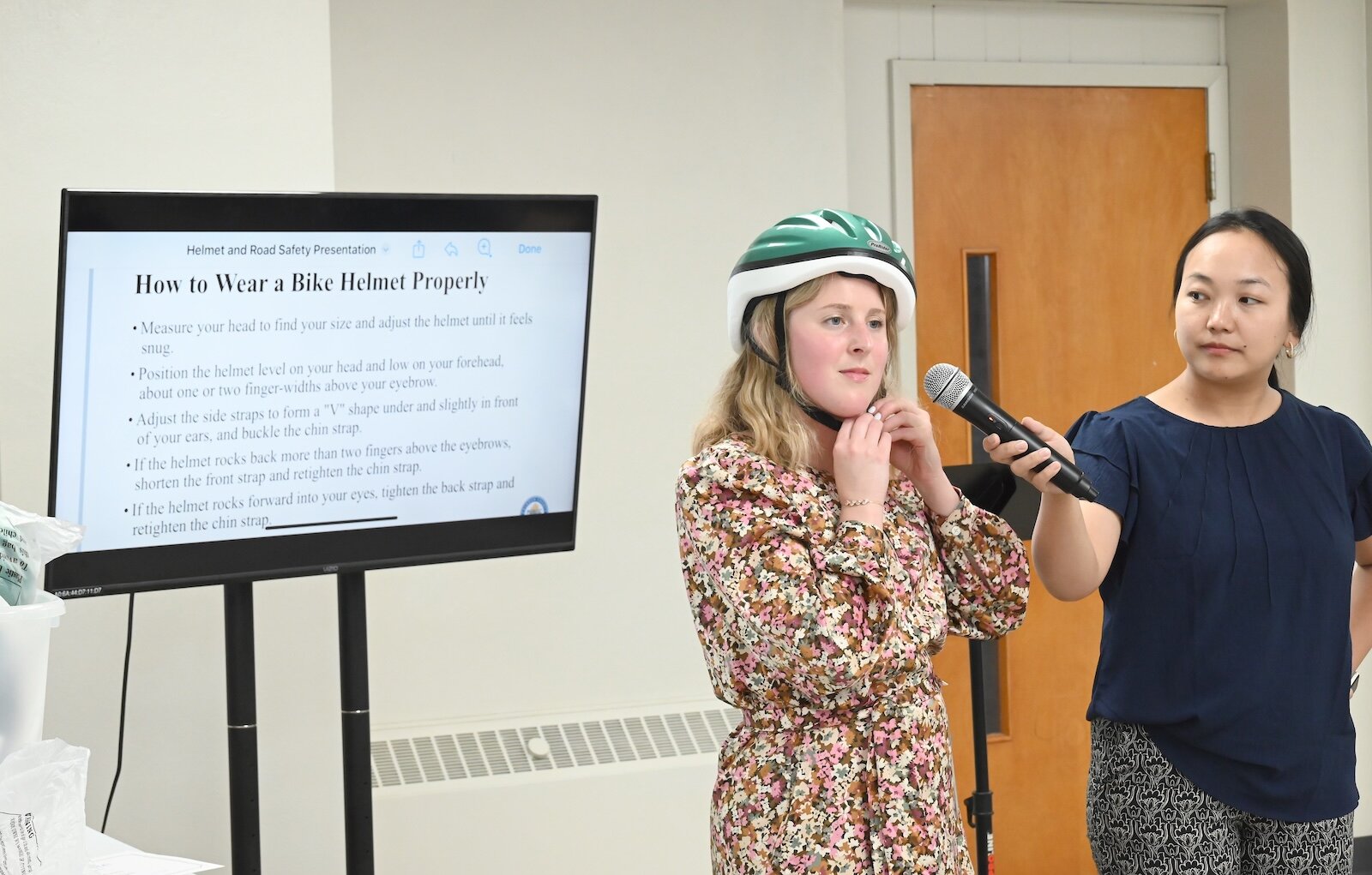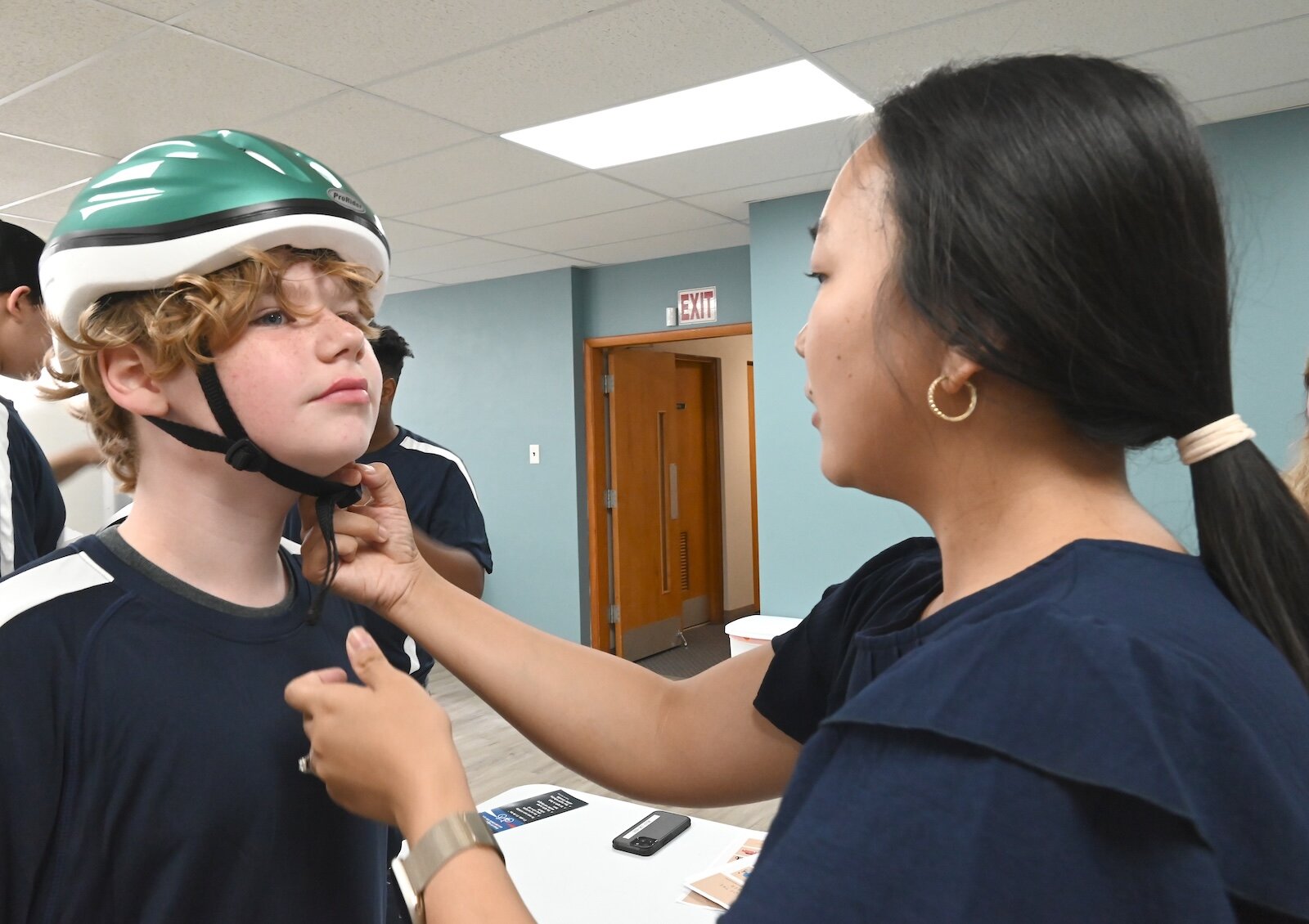 Avery Erskine gets help from Christina Swanset to properly wear a bicycle helmet.