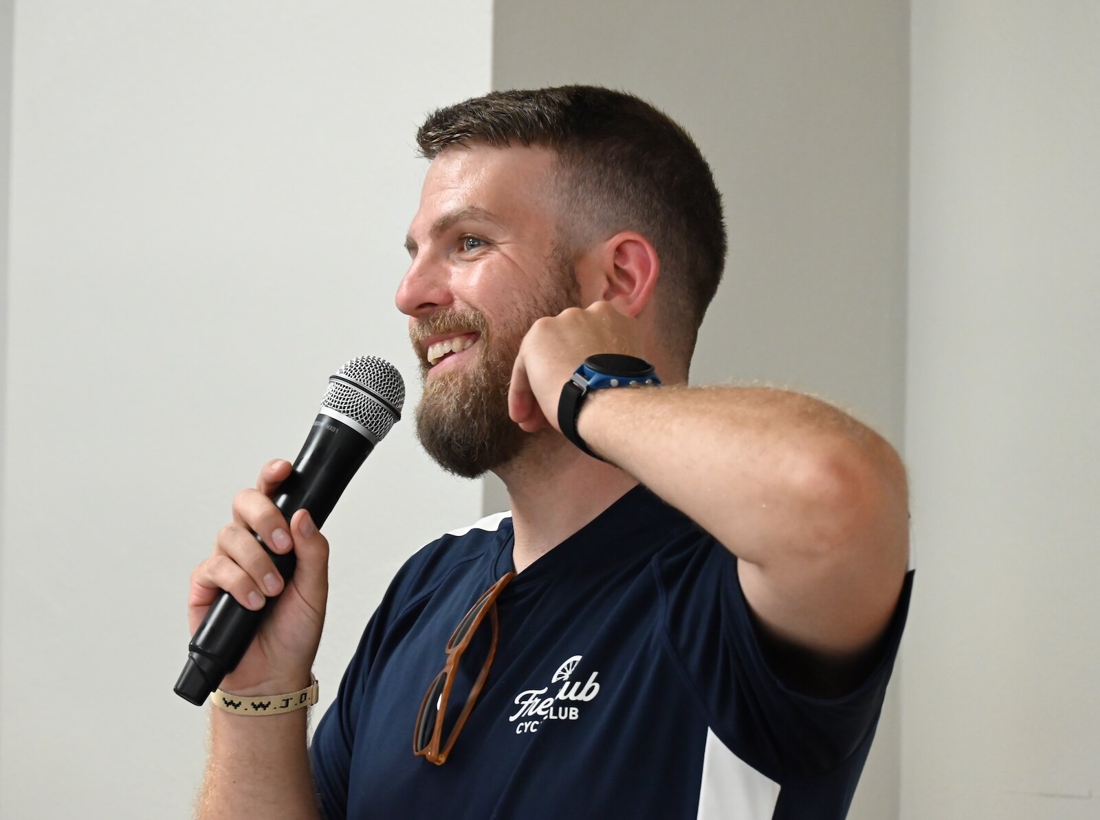 Colin Sherfield, Youth and Outreach Pastor at the Battle Creek Community Church, talks to members of the Freehub Cycle Club.