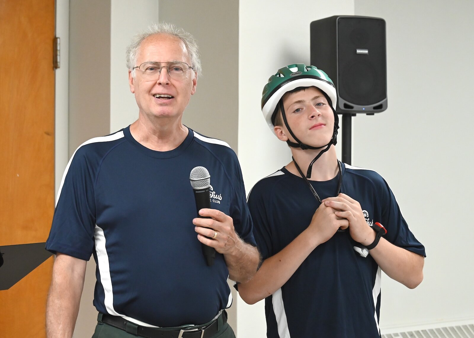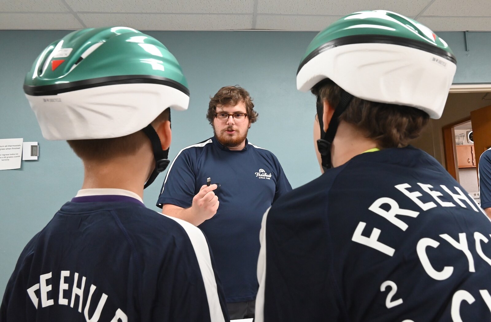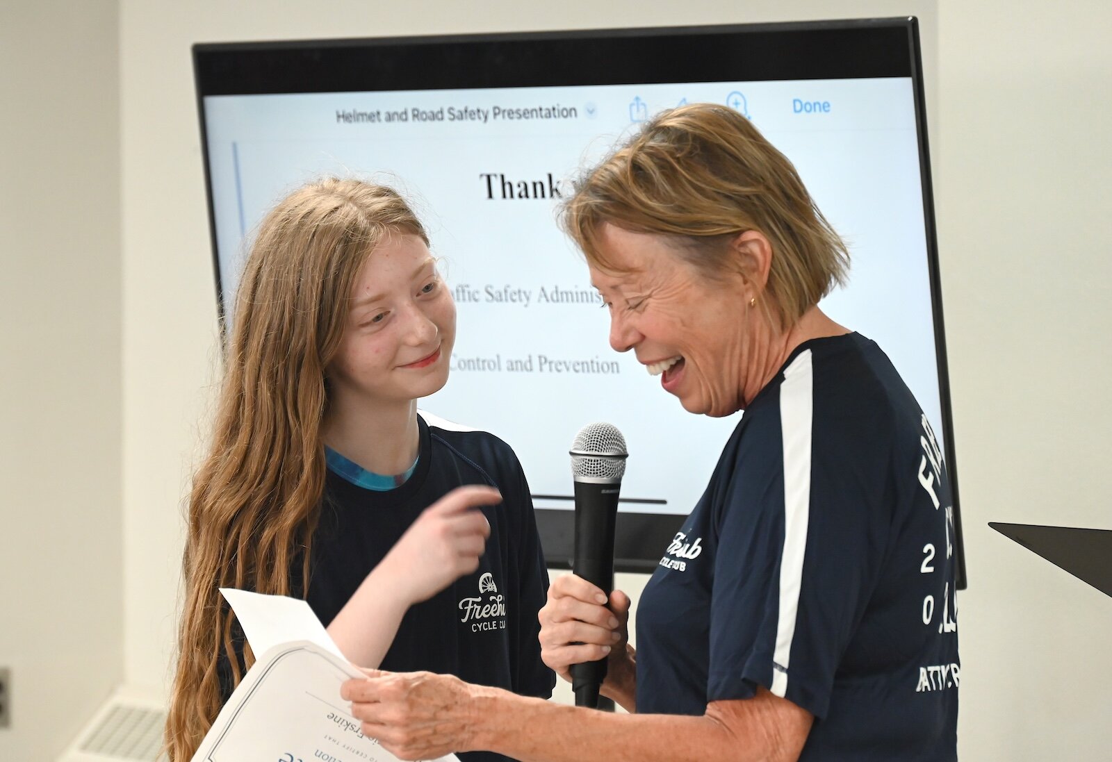 Mackenzie Erskine listens to her mentor Debbie Kelley talk about her during the Freehub Cycle Club’s meeting.