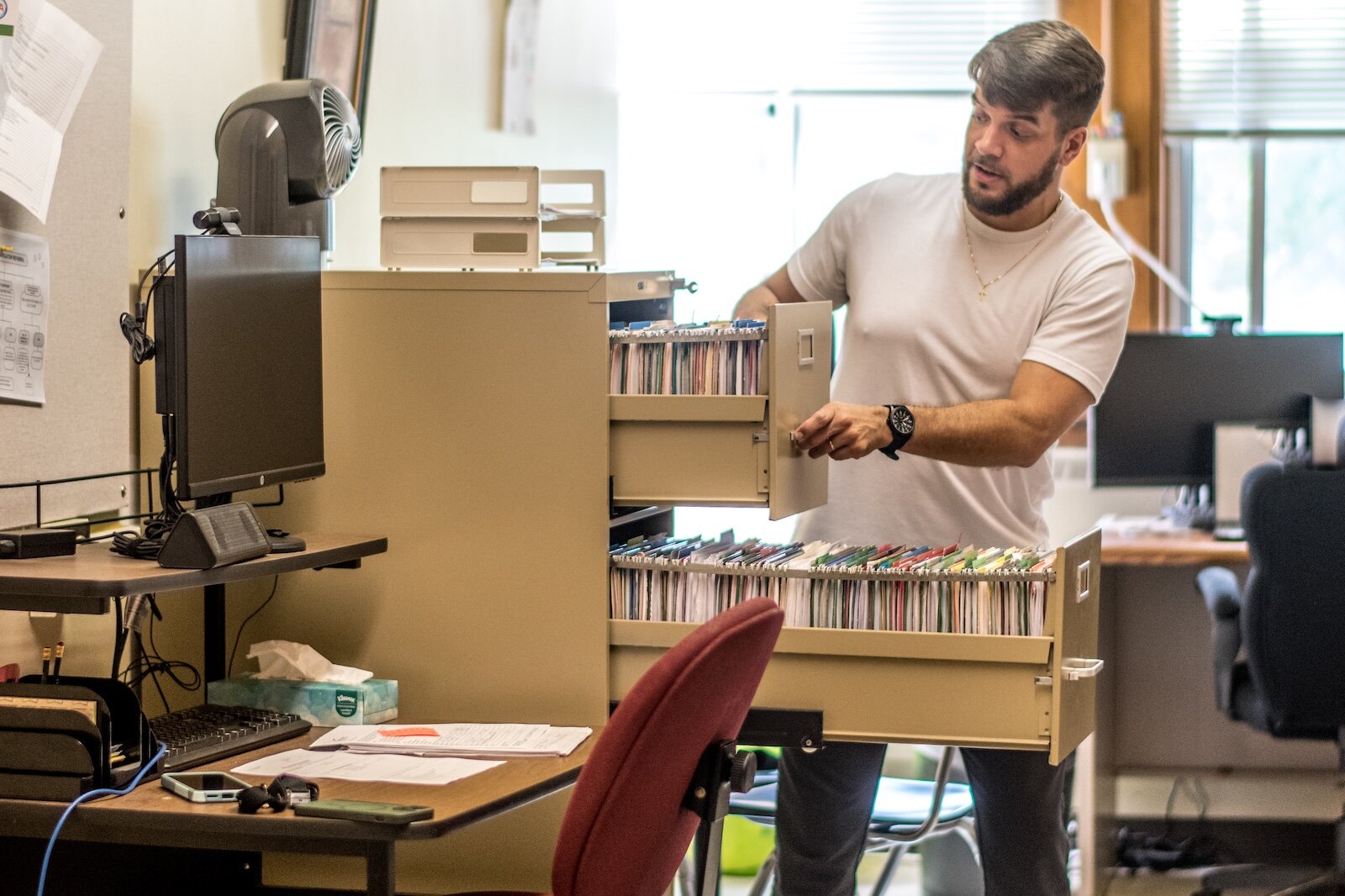 He then pulls out another drawer that’s full of people who need help. He also has a stack of referrals that he needs to get to. Plus, his phone had been going off throughout the interview — “Those are all families in need of help.”