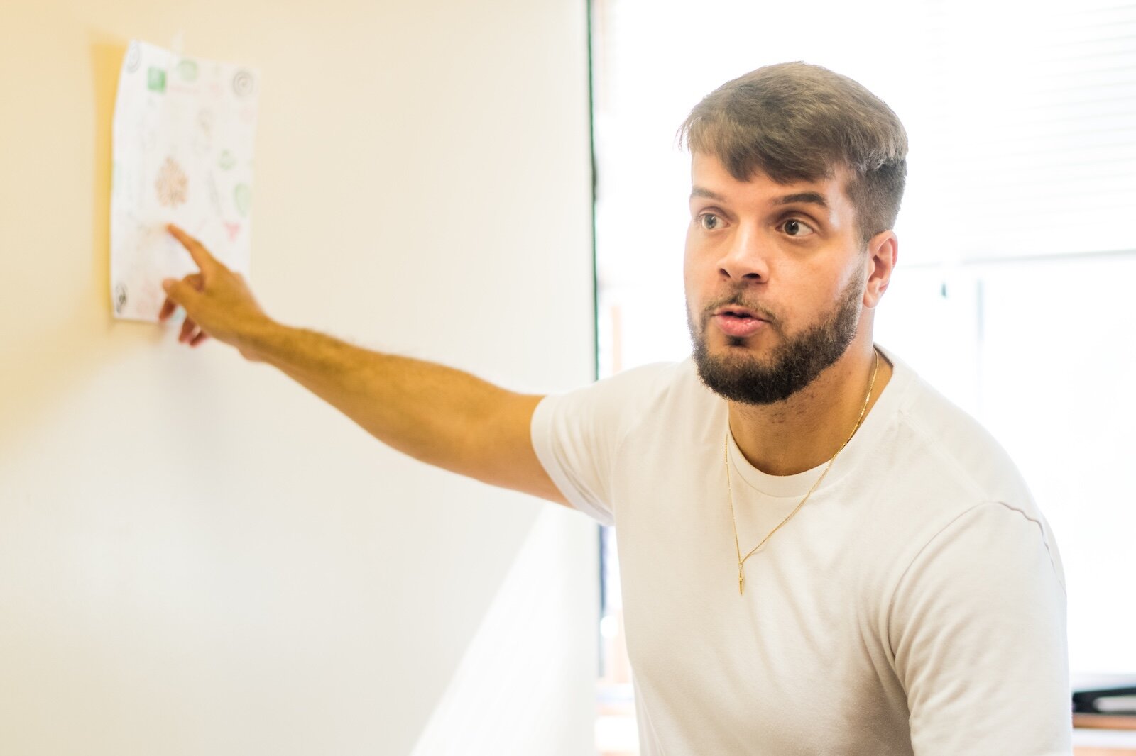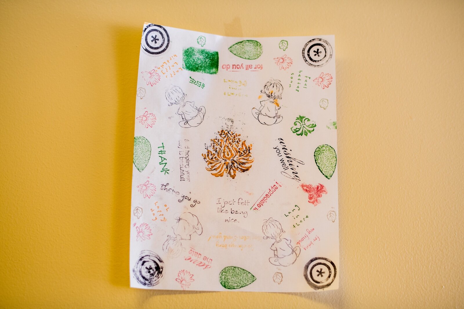Brandon Mion shows a sheet of paper stamped with messages of hope and thanks sent to him by youth he mentors at The Ark.