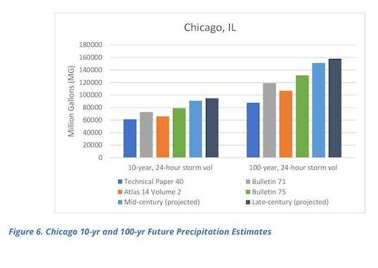 So far as future projections, for the mid- (and late-) century estimates, rainfall estimates are expected to increase: In Chicago, the rainfall amount is expected to increase by 15 percent by mid-century, and 20 percent by the end of the century.