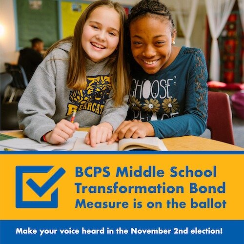 That energy included the placement of informational boards inside Northwestern and Springfield middle schools that highlighted how students would benefit from passage of the bond proposal; “Vote Yes” yard signs bearing the BCPS colors; and a “Yes for BCPS” campaign led by Jae Slaby, a BCPS Board of Education Trustee.