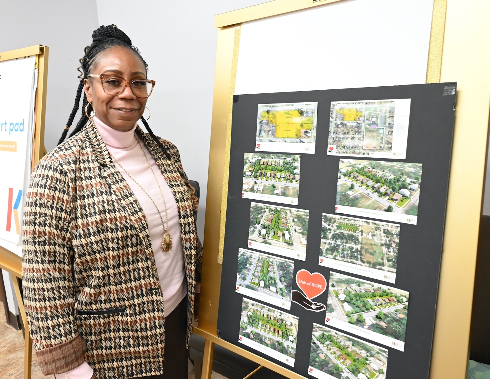 Rev. Monique French, pastor of Washington Heights United Methodist Church, stands next to a poster showing architectural concepts of the planned property development.