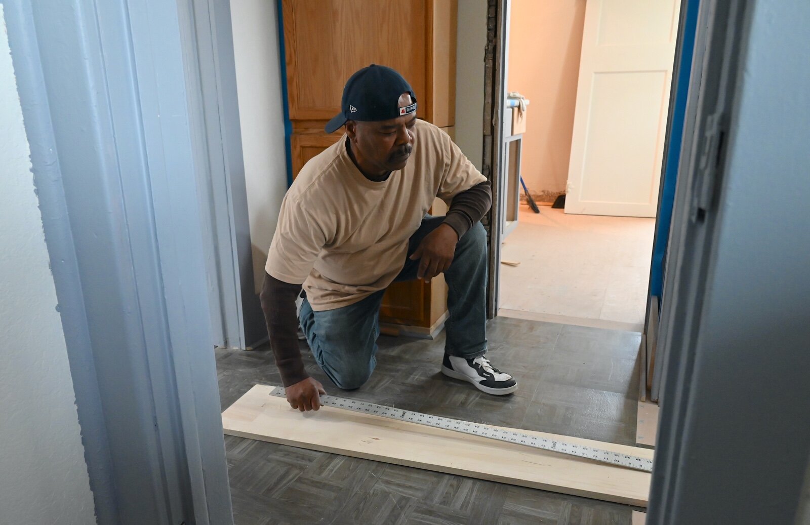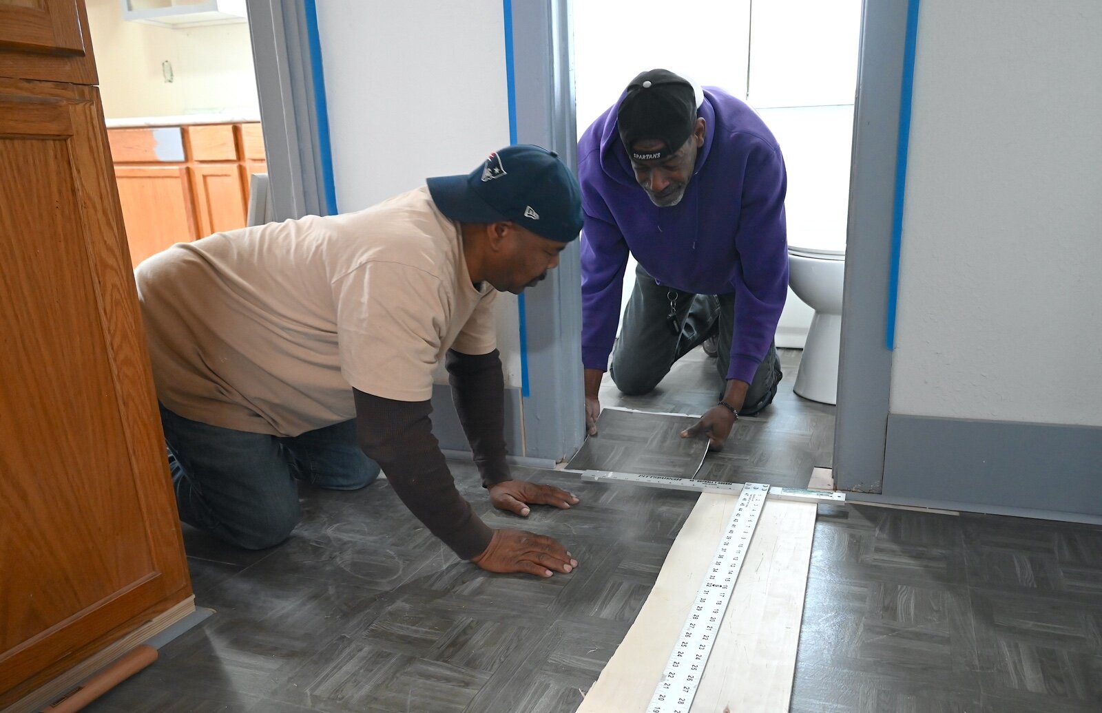 Robert Holley, left, and Aaron Cusic work on the flooring of the house at 238 Greenwood Avenue that Washington Heights United Methodist Church bought and is renovating.