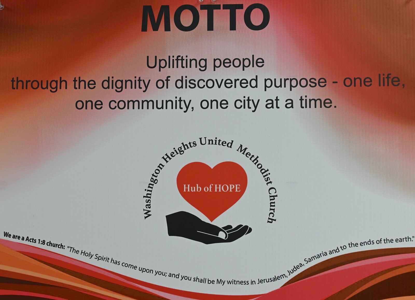 A sign in the board room at Washington Heights United Methodist Church indicates the motto of the church. 2 Rev. Monique French, pa