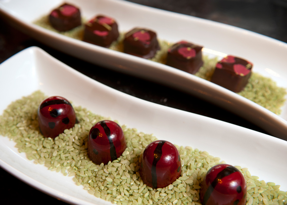 Lady Bugs with dark chocolate ganache filling, lower plate. Dipped dark chocolate ganache with a cocoa butter transfer on top.