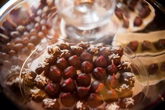 A selection of truffles and chocolates by Cherri Emery under glass.