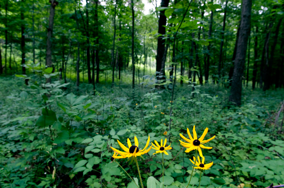 Black Eyed Susans bloom in the middle of a wooded area at Chipman Preserve.
