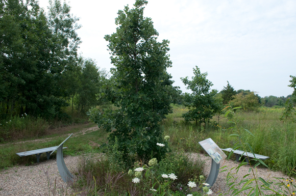 An burr oak tree stands at the middle of a circle of benches and information plaques on the Chipman Preserve.