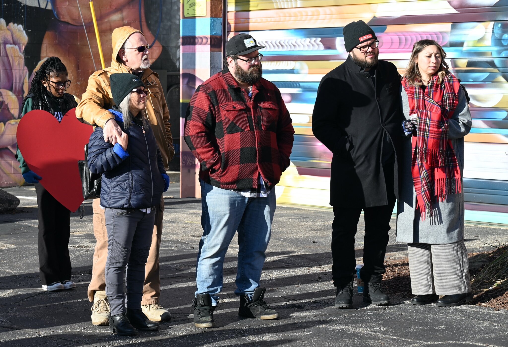 George Bredehoft speaks during Sunday afternoon’s vigil behind Cafe Rica.Elishaee Johnson, PhD, System Director Business Health Services at Bronson Methodist Hospital, talks about mental health services.Battle Creek Mayor Mark Behnke talks with Tristan and Michelle Bredehoft priorvto Sunday’s vigil.A heart-shaped floral arrangement sits near the back entrance of Cafe Rica.Seventy-five to eighty people attended Sunday afternoon’s vigil behind Cafe RicaBattle Creek Mayor Mark Behnke speaks and offers a prayer during Sunday’s vigil behind Cafe Rica.Seventy-five to eighty people attended Sunday afternoon’s vigil behind Cafe Rica.