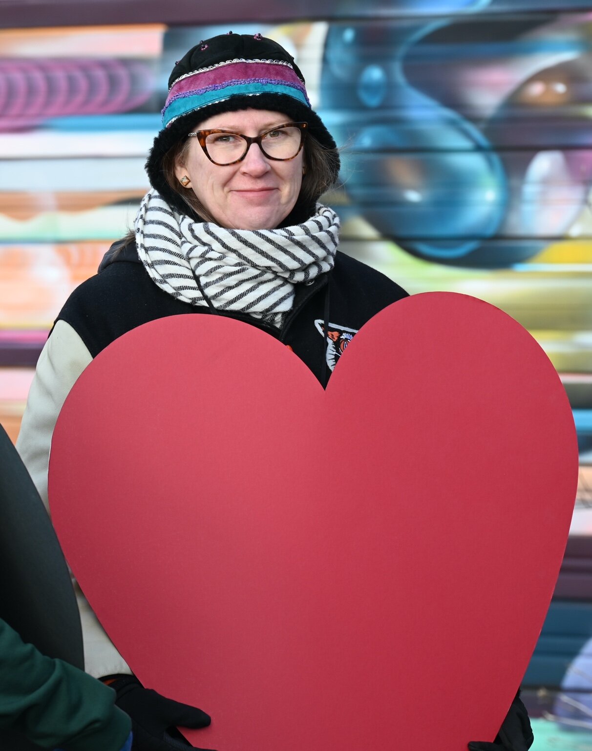 John Grap – Jill Anderson carries a heart at Sunday afternoon’s vigil behind Cafe Rica.