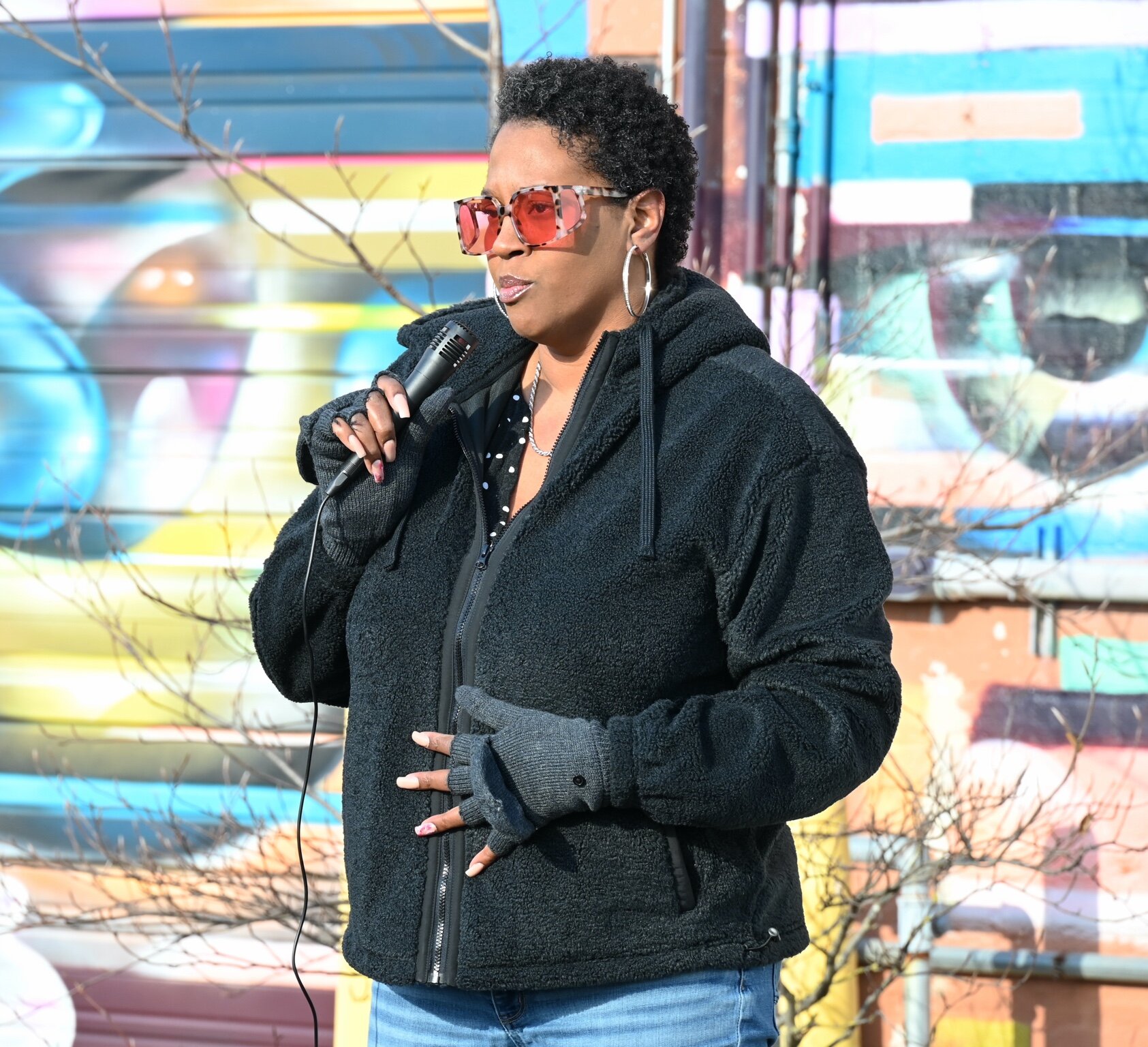 John Grap – Boonikka Herring, Racial Healing Coordinator at Battle Creek Coalition for Truth, Racial Healing, and Transformation, speaks during Sunday afternoon’s vigil behind Cafe Rica.