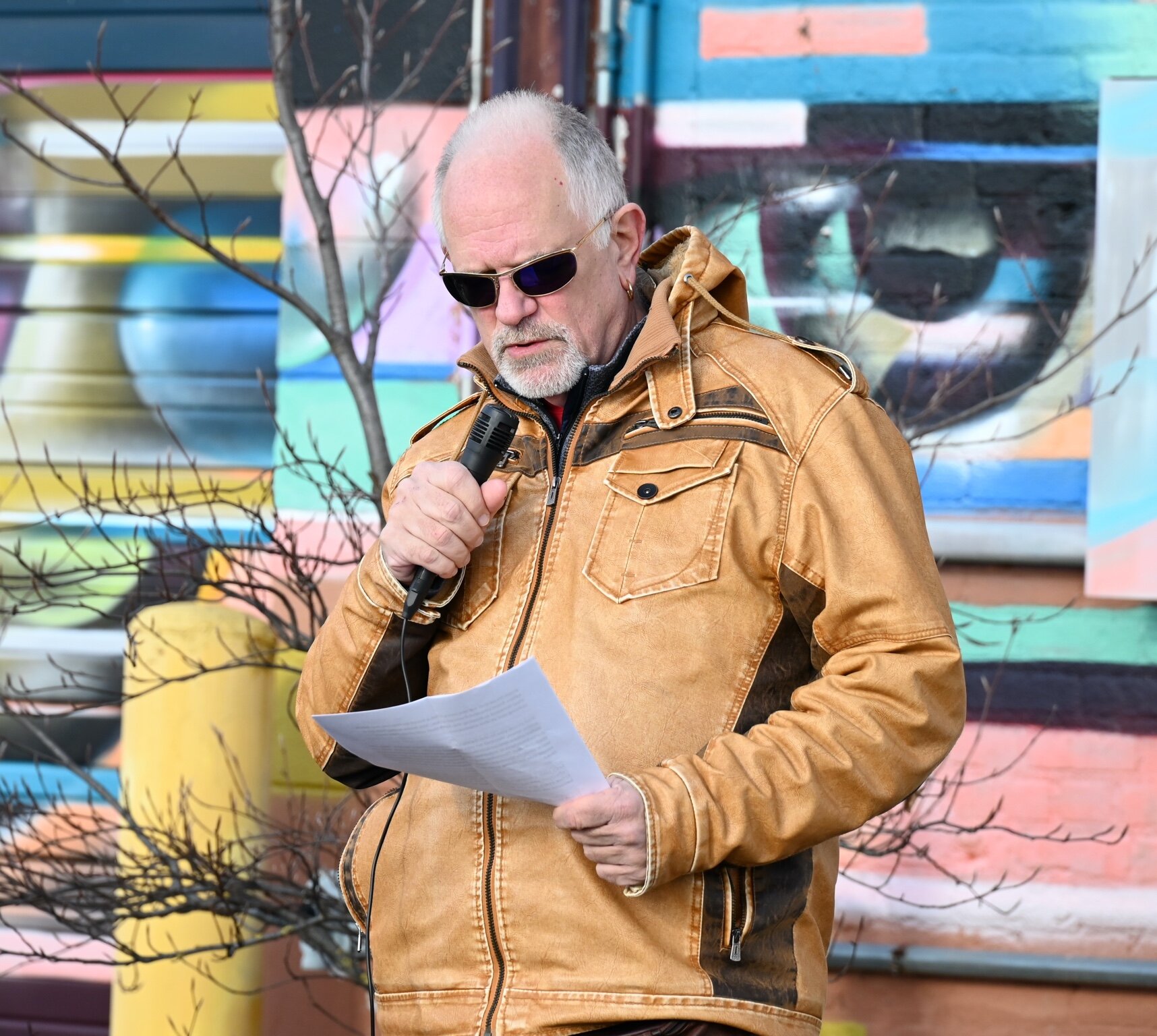 John Grap – George Bredehoft speaks during Sunday afternoon’s vigil behind Cafe Rica.