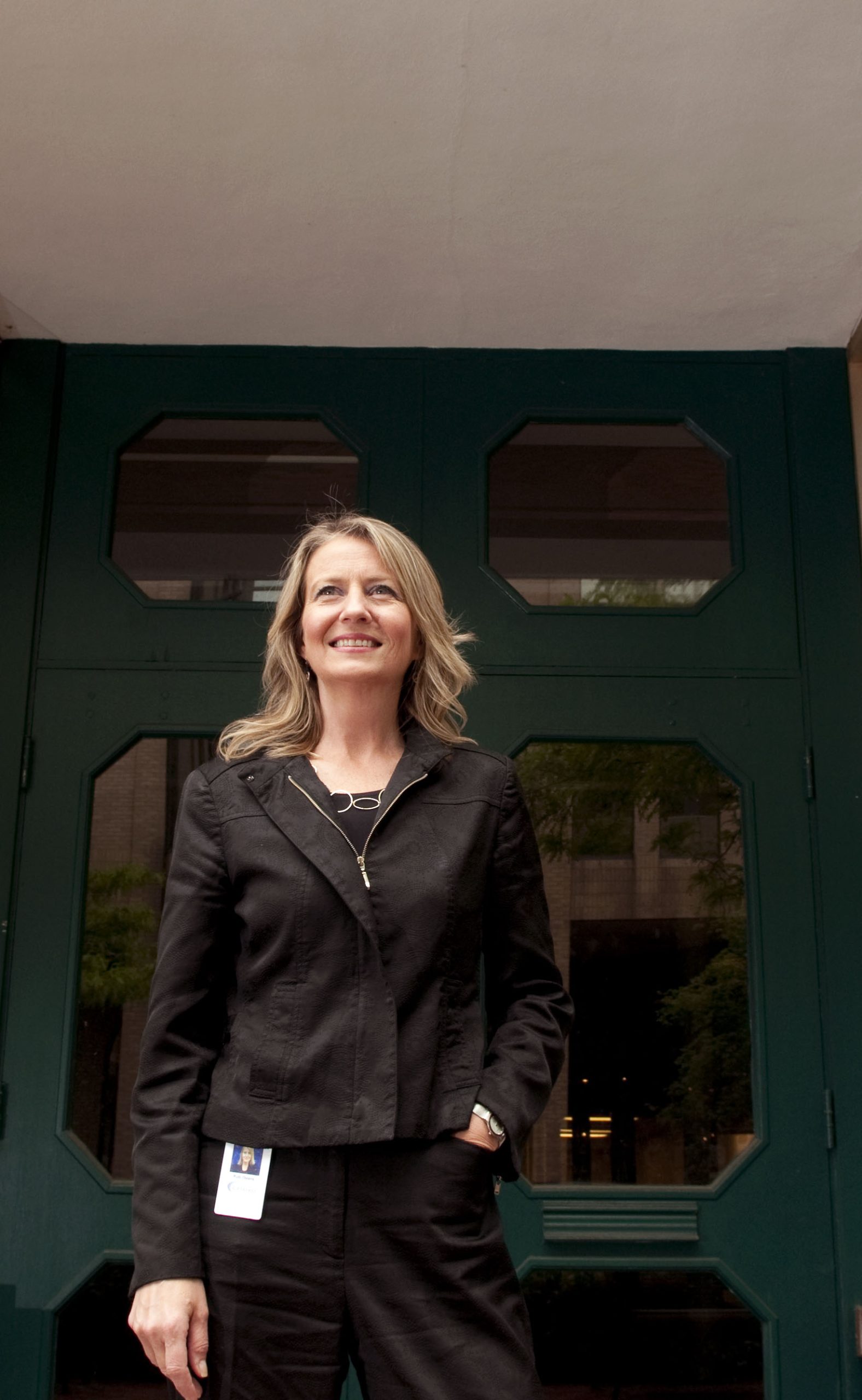 Patti Owen stands in front of the old city hall that will undergo remodeling as part of a redevelopment project for the site on the Kalamazoo Mall.