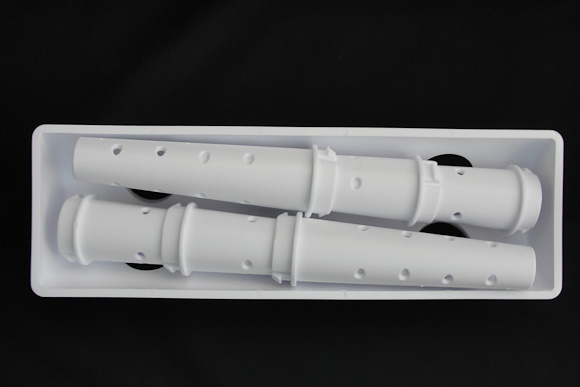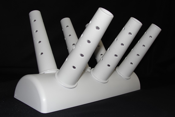 The end product is GreenGloveDryer. It has a 4-inch by 12-inch plastic base that sits over a floor register or leans against a baseboard register. It has six nozzles that are each 5.5-inches long and that have 16 holes for venting warm air into anything placed on top of them.
