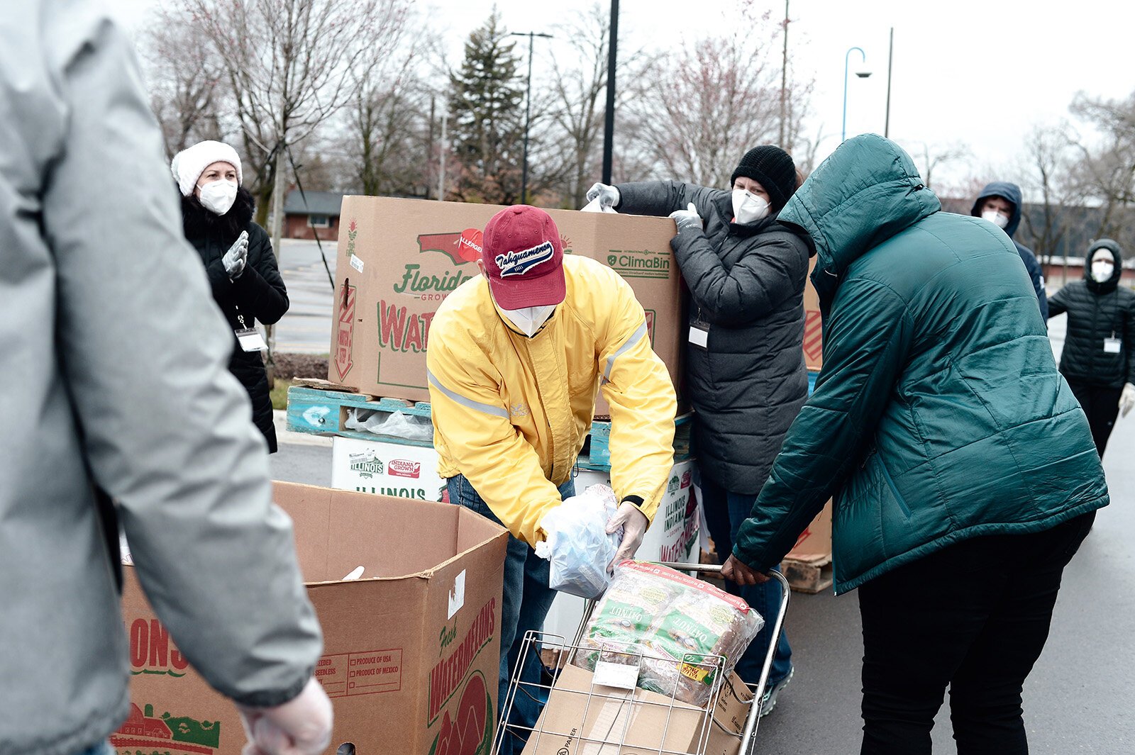 Because many charitable food agencies and pantries shut down due to the pandemic, Forgotten Harvest set up weekly distribution to 17 mobile emergency food sites in Detroit. Approximately 350 to 700 families line up at each site for contact-free pickup, with volunteers placing food boxes in clients’ car trunks. As Forgotten Harvest received most of the foods in large amounts, additional volunteers repackage items and create food boxes containing family-sized portions.