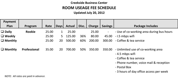 The 875-square-foot facility within the Creekside Conference Center opened last August with room for about 20 individuals from all walks of life to conduct business at prices that are tough to beat.
