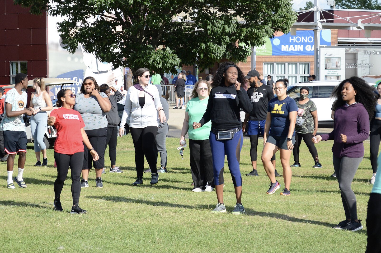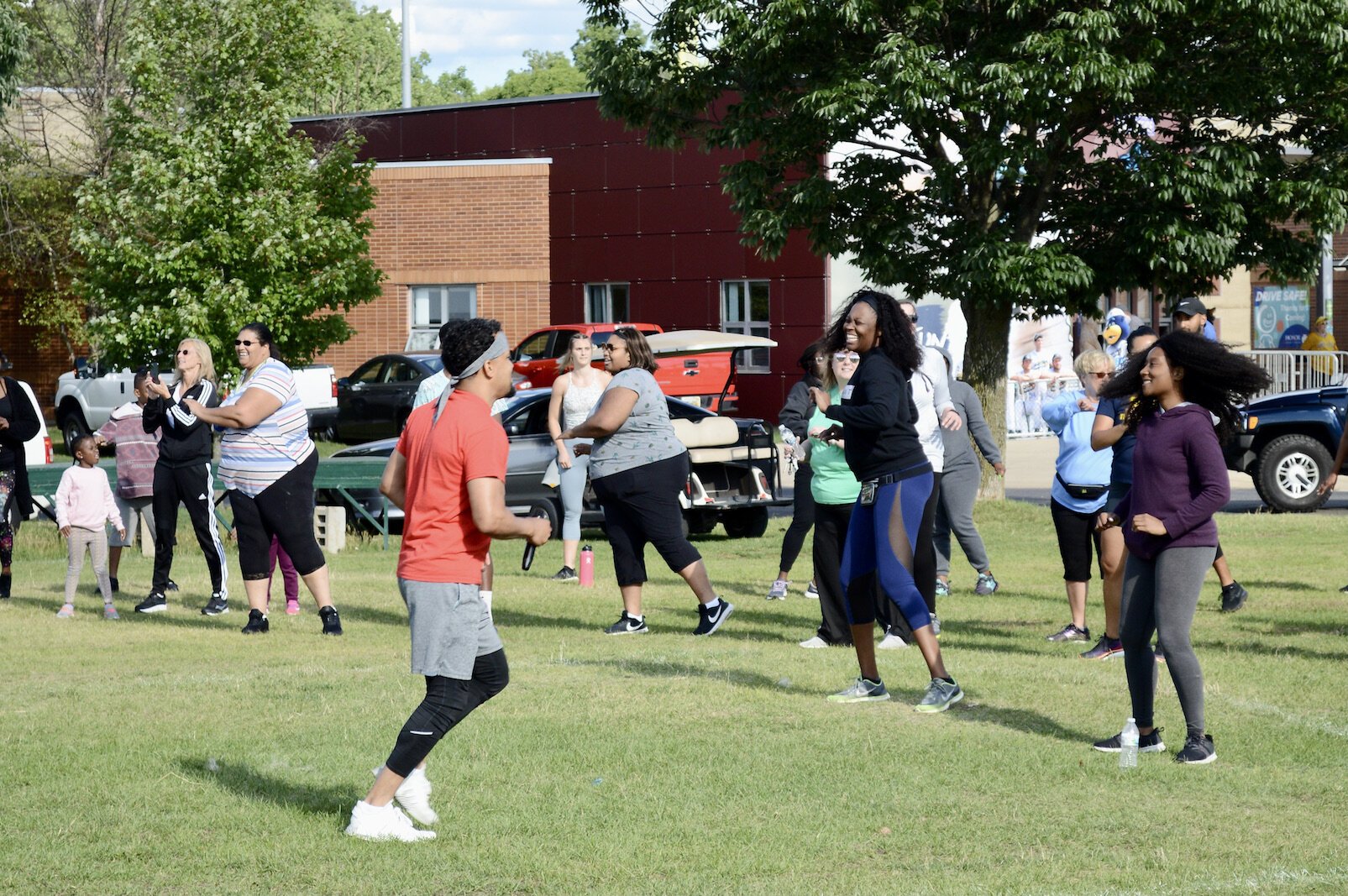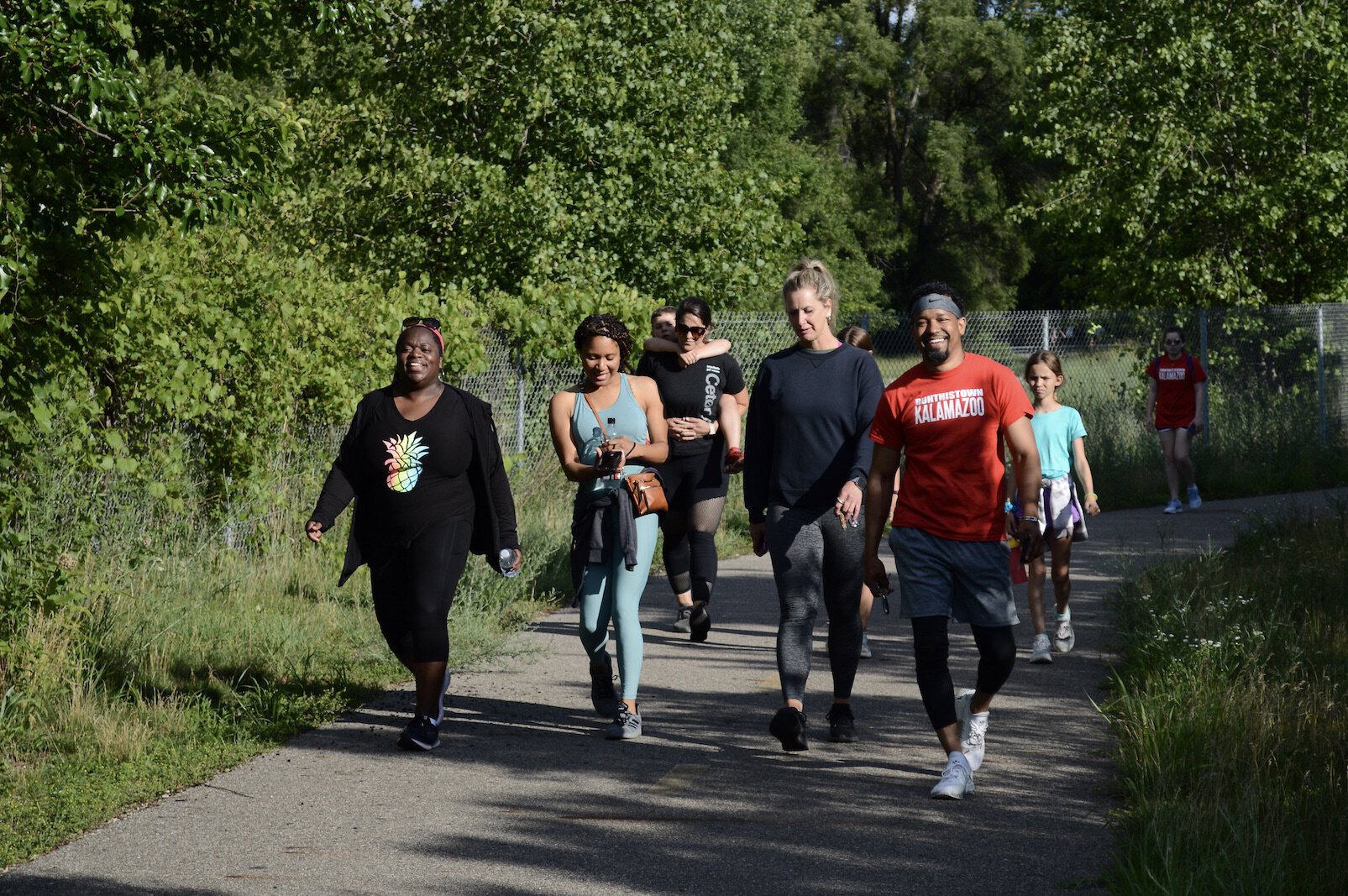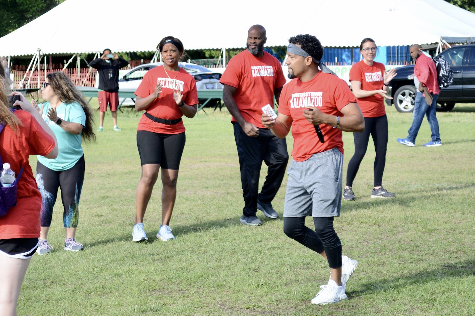 On a sunny June 22, at Mayors’ Riverfront Park, Eric Cunningham (Kalamazoo City Commissioner) and Carmen James (fitness instructor and owner of Fit Bellavei) were leading a warmup of a very diverse group of fitness enthusiasts.