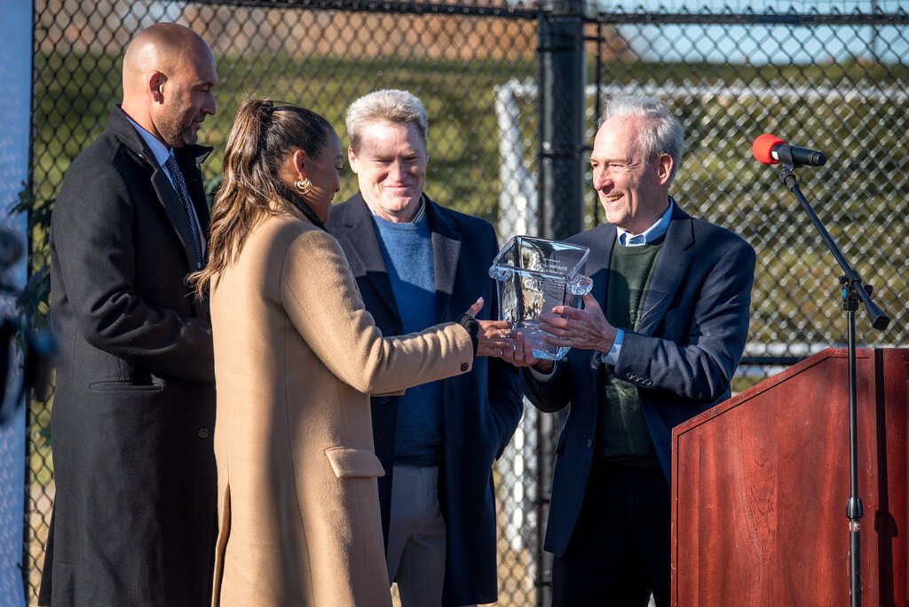 “The baseball and softball fields are where many young people recognize their passion,” Jeter told about 200 school officials, students, reporters, and others who attended Tuesday morning’s dedication. “They realize their passions and learn how to overcome obstacles. I learned a lot of things that helped shape me as a player, but more importantly, as a person. And that’s work ethic, it’s passion, it’s family.”