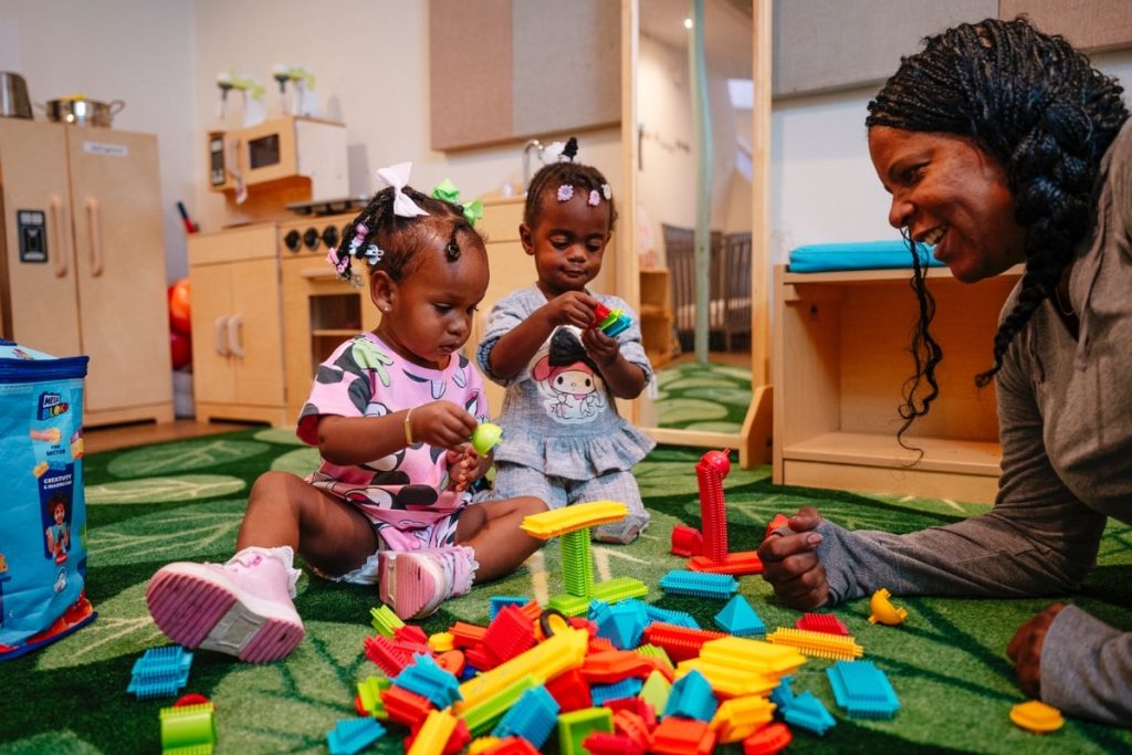 Tia Simmons, Crystal Swann toddler teacher, plays with magnet tiles with River and Amir.