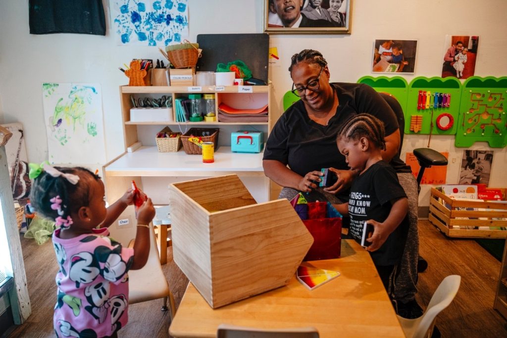 From left, River and Riyann play with Felicia Legardy, owner of Crystal Swann, a home-based child care in Detroit.