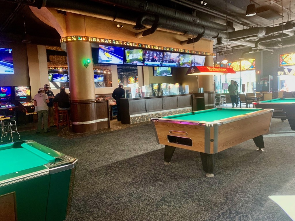 “We took out the big stage so we could have more flexibility on our grand opening weekend,” Flora says. “We were able to take two of these pool tables out. And we were able to put in a big 15-foot by 15-foot dance floor and have a DJ. In the future, we will be doing live bands, as well.”