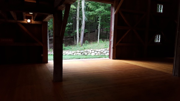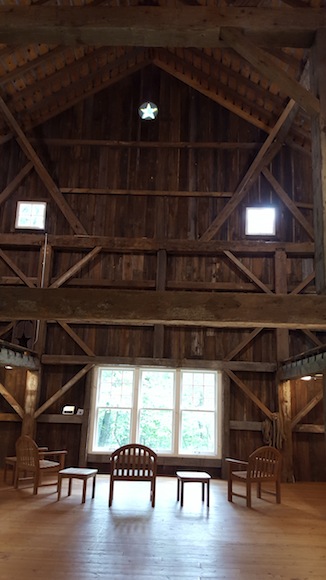 The barn, originally located near Newaygo was disassembled by an Amish crew and trucked to the property being donated to the Nature Center. Pieces of the building that were no longer safe were replaced. Ninety-five percent of the original barn, built in 1881, was retained though some parts were used in new ways. For example, the cladding for the barn siding was reused on the interior. Instead of a stone foundation, a poured walls with stones affixed to them were built.