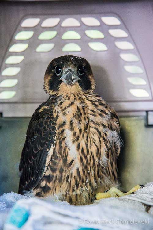 In 2016, two birds ended up in rehab–one left the nest too early, perhaps by falling or being pushed, a second hit the Radisson Plaza hotel. The first spent 10 days in rehab as its feathers grew and unfurled. It flew in progressively larger flight cages as it stretched its newly developed wings.