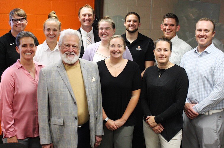 Dana Getman with Director of Athletics Becky Hall and Women’s Athletics Coaches: A fund announcement event for the establishment of the Getman Endowment for Equity in Women’s Athletics included (front row, left to right) Director of Athletics Becky Hall, Dana Getman ’68, Women’s Lacrosse Coach Jess Smith, Women’s Basketball Coach Katie Miller, (back row, left to right) Women’s Tennis Coach Mark Murphy, Softball Coach Kelli Duimstra, Women’s Soccer Coach Bryan Goyings, Swimming and Diving Assistant Coach Beth Mitchell, Women’s Volleyball Coach Hunter Bishop, Cross Country Coach Kyle Morrison and Golf Coach Josh Burt.