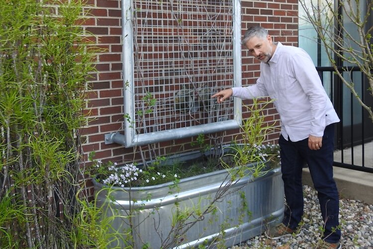 In addition to a rooftop rain garden, a drain system funnels rainwater to planters around the building, where climbing plants grow up trellises. Targeted redirection of rainwater is important in that part of town, Hollander says, with the neighborhood half a block to the west situated in a 100-year floodplain and susceptible to bad flooding.