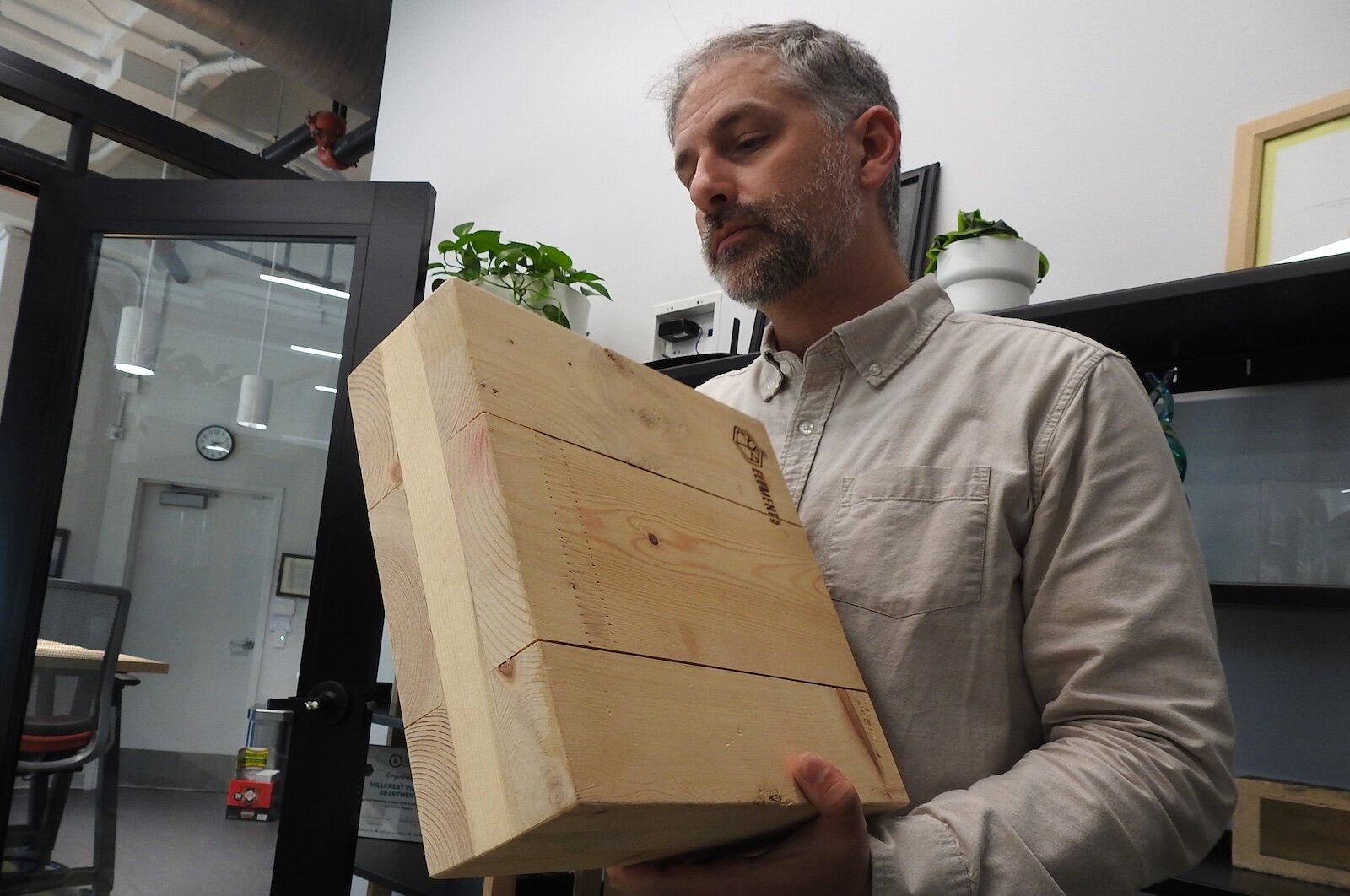 Matt Hollander, president of Hollander Development Corp., displays a section of the mass timber his company plans to use to build an all-electric, high-efficiency housing complex in Calhoun County.