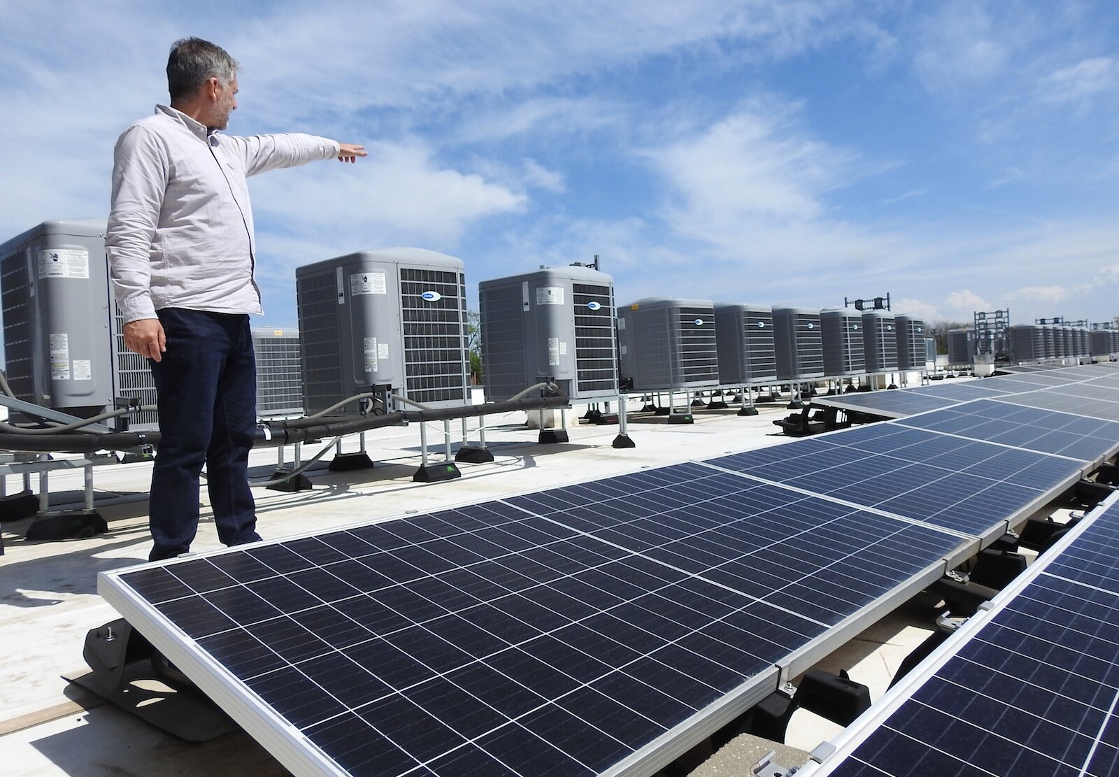 On the roof of The Creamery, a climate-friendly housing structure in Kalamazoo, developer Matt Hollander displays specialized heat pumps and trains of solar panels, enough to power seven small single-family homes.