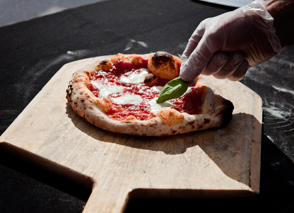 Like the food truck chefs, Baker, too, is a believer in going back to what food was meant to be before it became industrialized. His pies are not symmetrical or uniform. Every bite, he promises, will bring a different flavor. And chances are good, he warns, that you won’t be biting into any pepperoni. Instead, expect prosciutto, arugula, balsamic reduction, Kalamata olives, or any number of untraditional pizza toppings and ingredients.