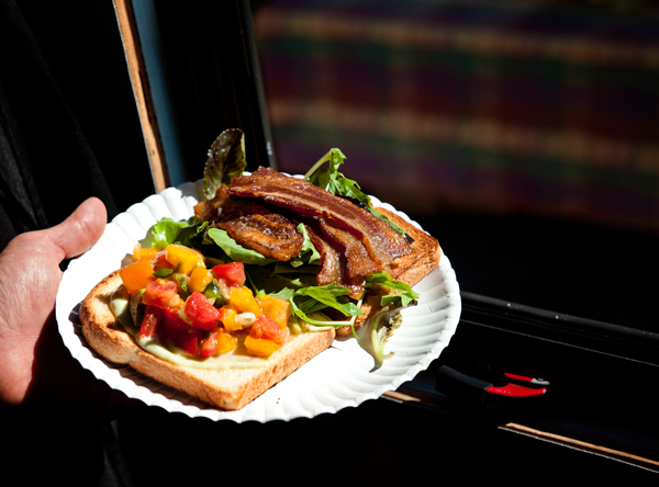 Out on the street, outside in the farmers markets, alongside parks, with no restaurant in sight, the smells of fresh food cooking waft through the air and tantalize. Tomatoes gently roast, bacon sizzles, fresh mozzarella melts and oozes, forming tiny cheesy bubbles. Mushrooms swim in warm butter. Meats simmer and spices pepper the air, stirring appetites.