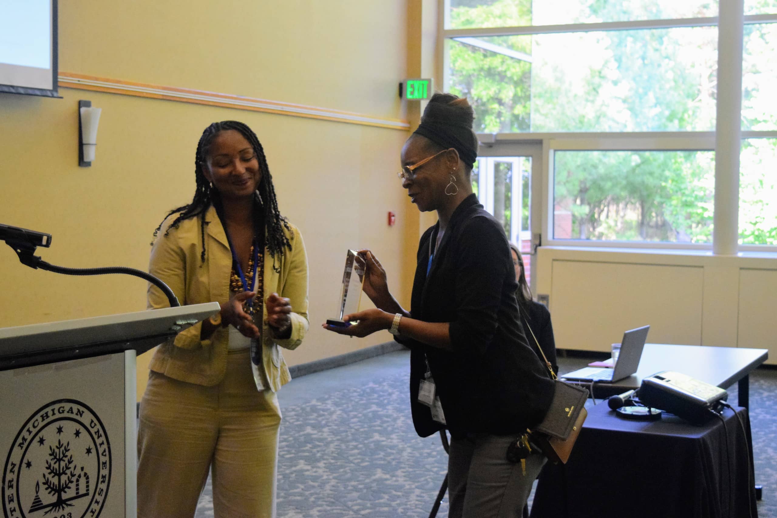 Anita Johnson accepts the award honoring her with the Community Impact Award for efforts that have significantly improved the housing outcomes for individuals or families in Kalamazoo County.