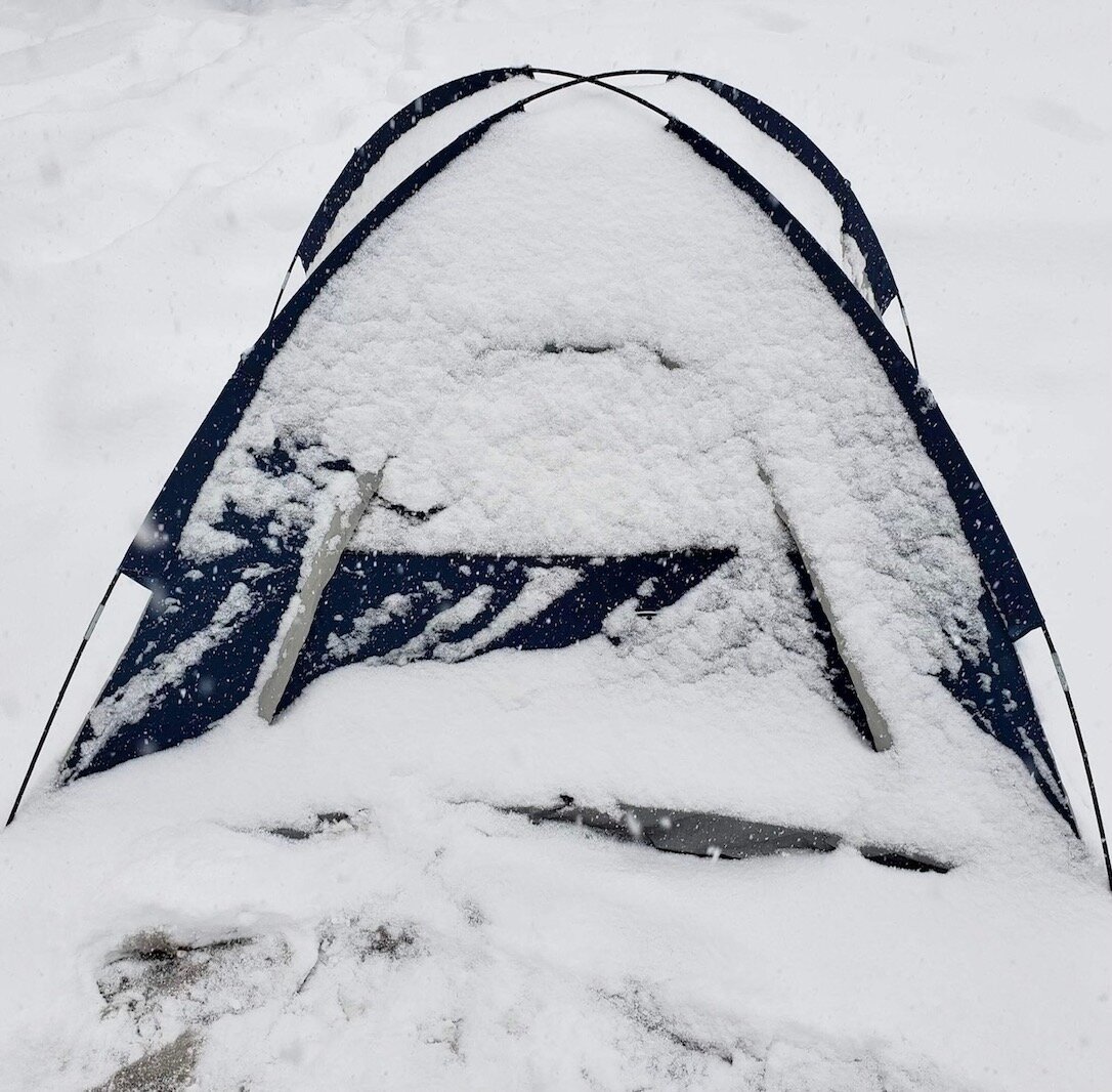 “So we had a donation of a tent,” says Walter. “And whenever we get a used donation, we want to set it up and make sure it’s got all the parts and actually works. So a couple of volunteers went out and set it up. And then the snow happened.”
