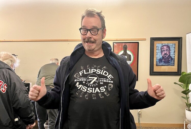 Matthew Sahlgren, a former Flipside clerk, in his 1992 Hands Across Eleanor shirt.