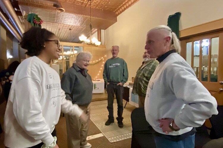 Several people gathered for an IPS-sponsored talk on the unique history of a downtown business corner.