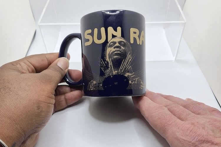 Juhl brought artifacts for his talk. One, a Sun Ra coffee mug, showed how the store had everything for the unique music lover, even coffee cups dedicated to Afrofuturist experimental jazz musicians.