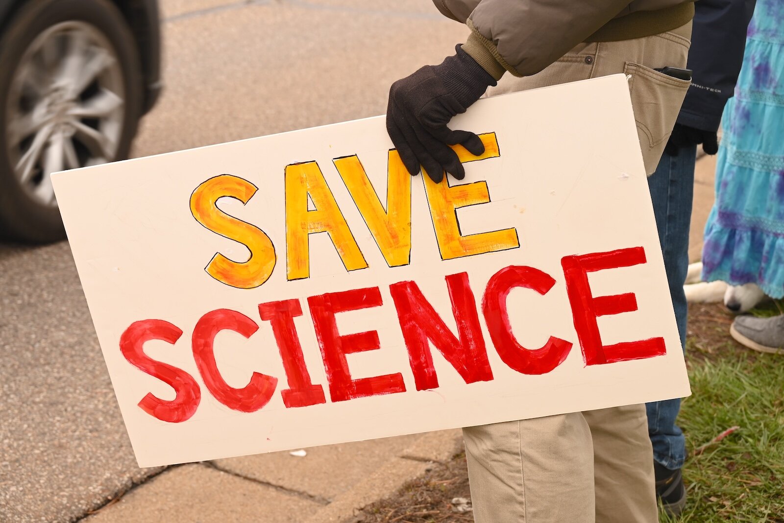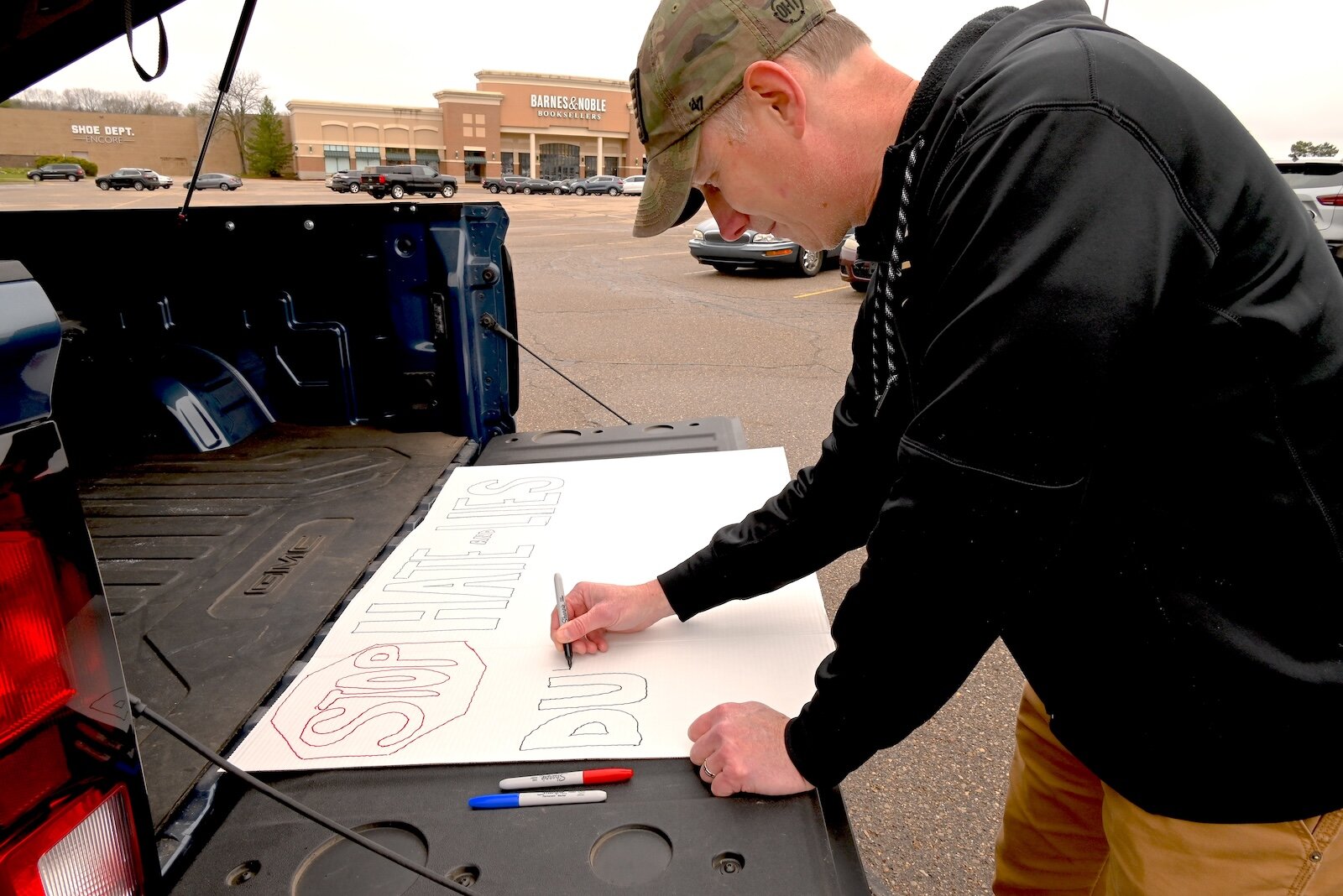 “I’m here today to support my local union and my fellow Department of Defense civilian employees, and the War Fighter and NATO and everyone we support from allies to the American Public,” Wilkins said while writing his message on a piece of poster board laying on the liftgate of his truck of his presence at Battle Creek Hands Off! peaceful protest.
