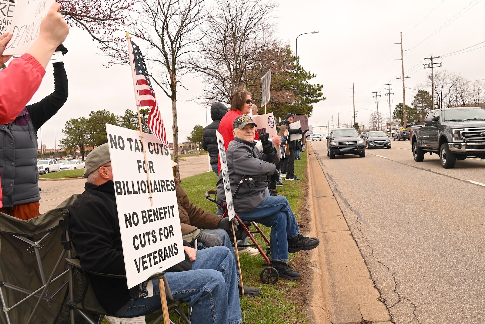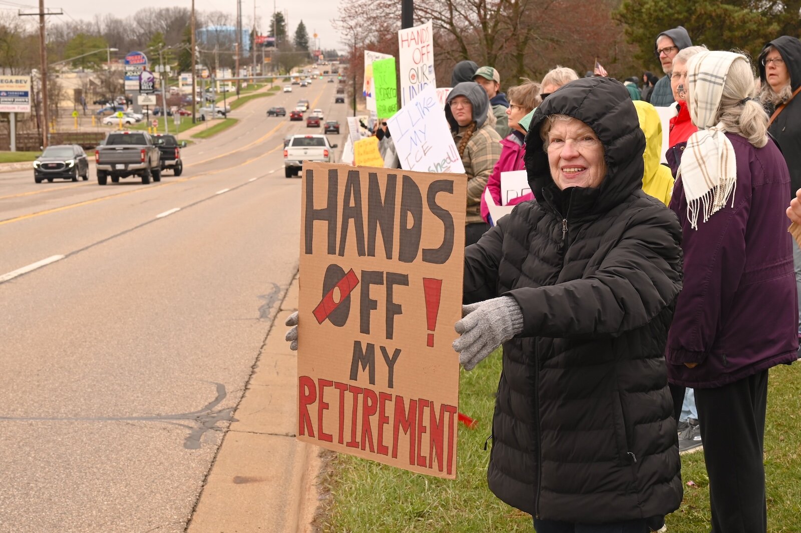 Her mother, Linda Boyle, who was visiting from Boston, carried a sign that said “Hands off My Retirement” and said it would take unity to create the change protesters are calling for. She said the Battle Creek protest was her first and likely not the last.