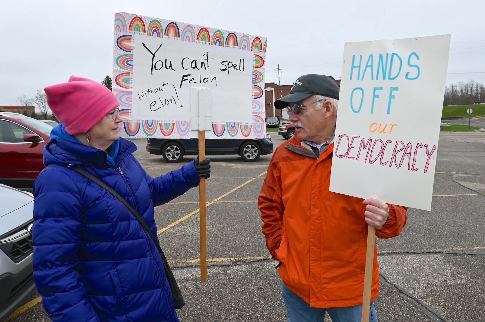 Colleen LaRose, left, and Al Lake hold signs as they prepare to attend the April 5 Hands Off demonstration on Beckley Road in Battle Creek.