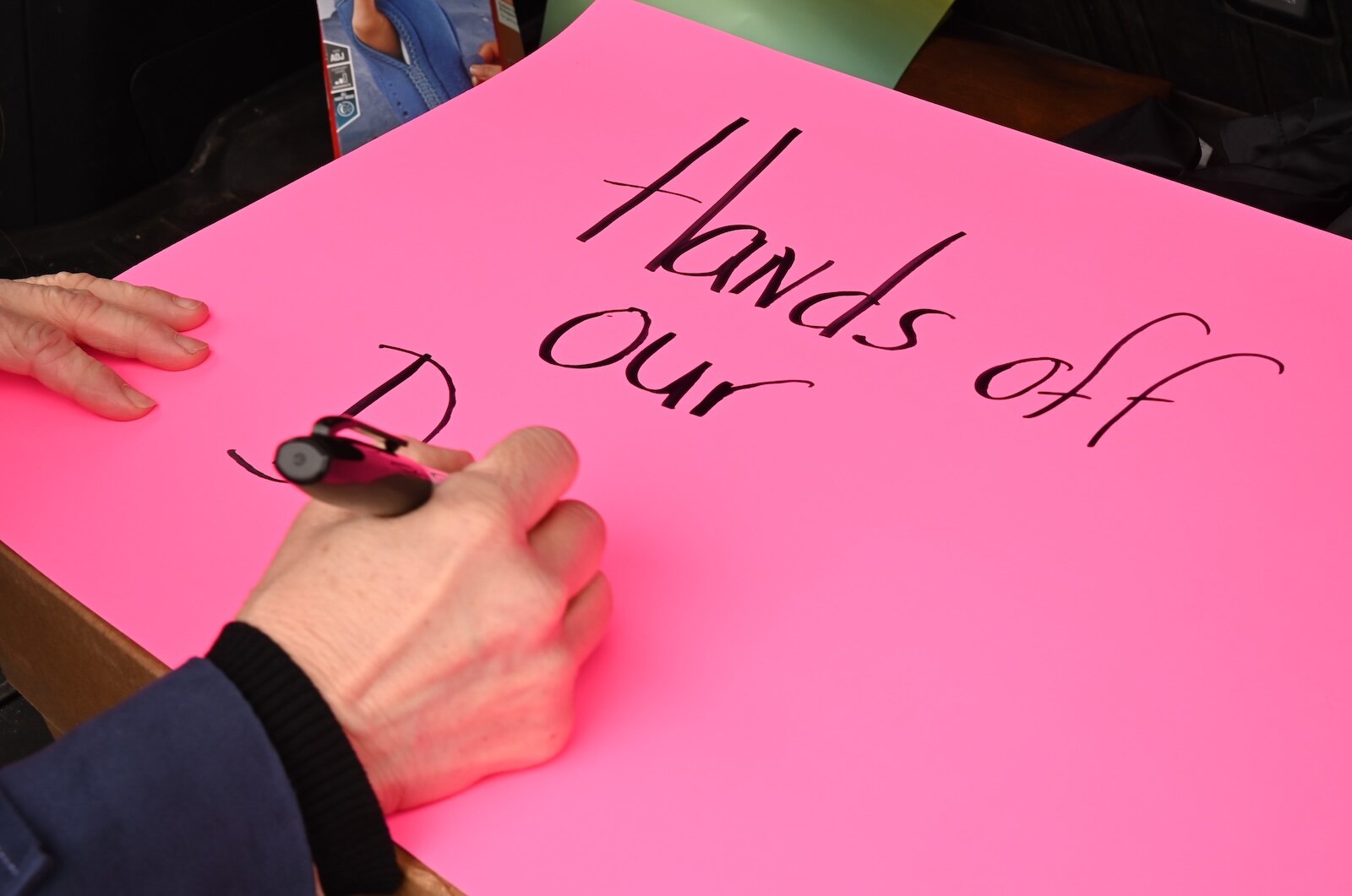 Phil Wilkins prepares a sign for the April 5 Hands Off demonstration on Beckley Road in Battle Creek.