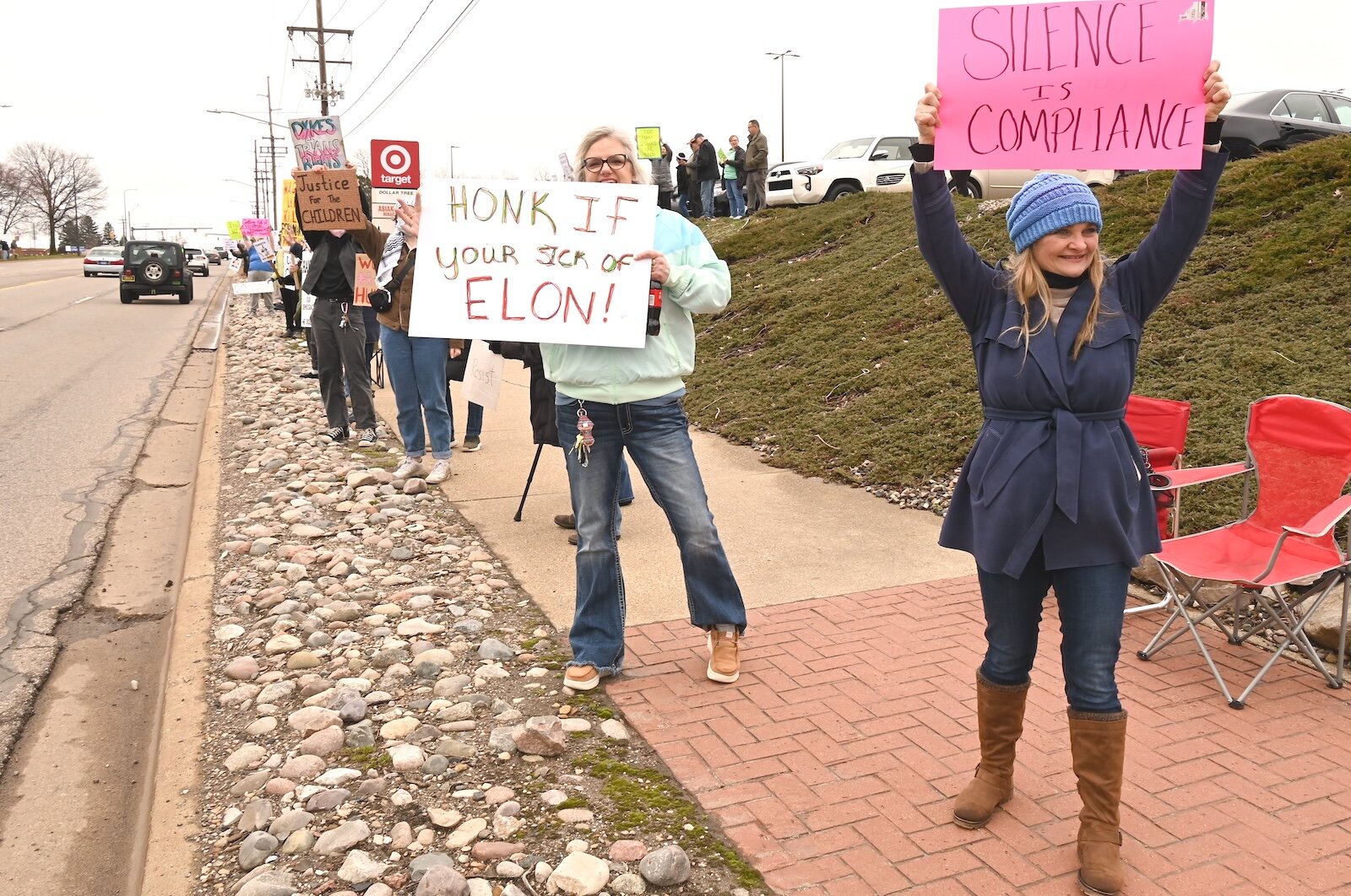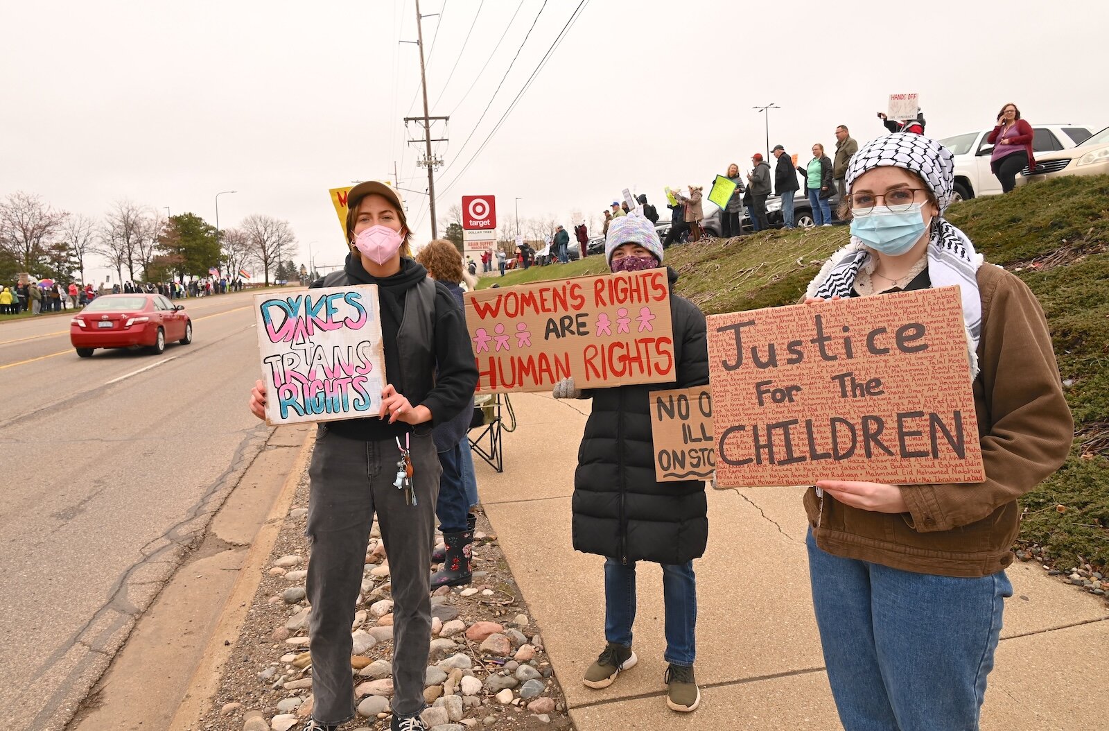 Alisha Carr, right, and others participate in the April 5 Hands Off demonstration on Beckley Road in Battle Creek.