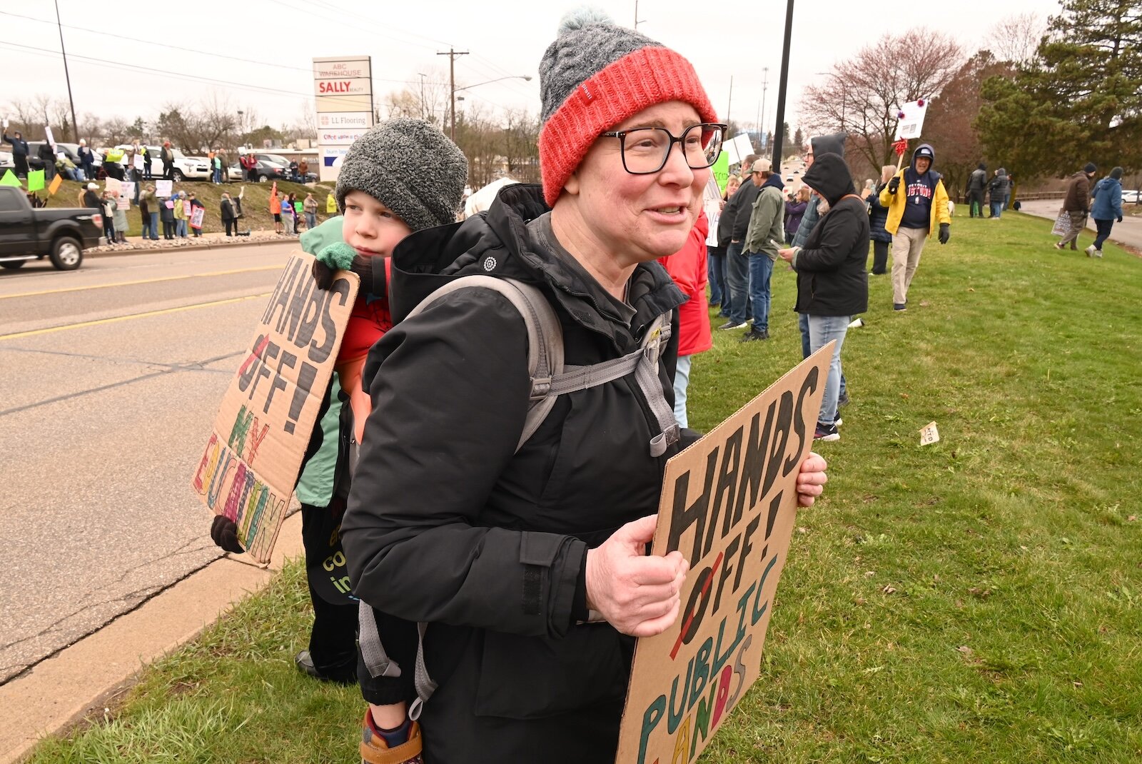 Robin Boyle with son Ethan Kellogg attended the April 5 Hands Off demonstration on Beckley Road in Battle Creek.
