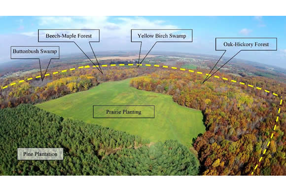Features of the new preserve, currently called the Heath Road Tract, are rolling beech-maple and oak-hickory forests, buttonbush and yellow birch swamps, a marsh, prairie planting, and pine plantation.