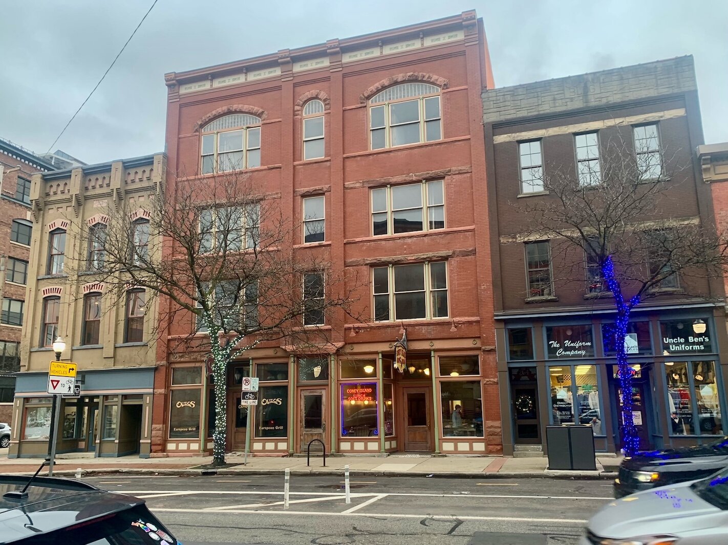 The Coney Island building is a brick and wood structure that shares walls with buildings to the east and west.